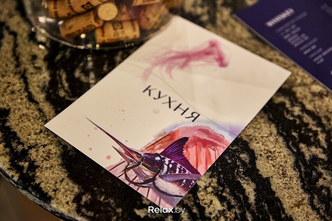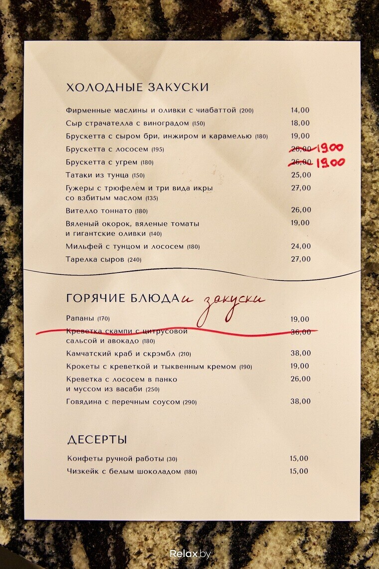 Меню лаконичное, в нем с большего закуски, хотя есть и несколько горячих позиций. Цены назвать доступными сложно, впрочем, а где сейчас дешево. Очевиден упор на морепродукты. Так рапаны можно попробовать за 19 рублей, камчатского краба и скрэмбл — за 38 рублей, крокеты с креветкой и тыквенным кремом — за 19 рублей, говядину с перечным соусом — за 38 рублей. Средняя цена за бокал — 17-18 рублей.