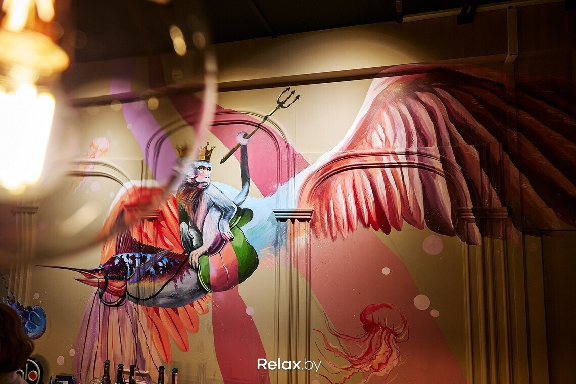 Интерьер можно назвать минималистично современным. Бар достаточно светлый, его сложно назвать ламповым. Но атмосфера получилась вполне праздничной. Комфортная посадка для небольших компаний, мягкие пудровые цвета, ироничные рисунки на стенах, явно авторские инсталляции на потолке. К слову, пространство бара изменилось до неузнаваемости. Если раньше вы бывали в «Бардаке», а затем и в не очень удачных проектах — «Башъ Бар» и «Наш Бар», то приятно удивитесь: здесь поменялось без преувеличения все. Не обошлось и без пульта диджея: все-таки заведение в тусовочном центре, и чинные вечера с бокалом совершенно точно будут перерастать в шумные вечеринки — это неизбежно.