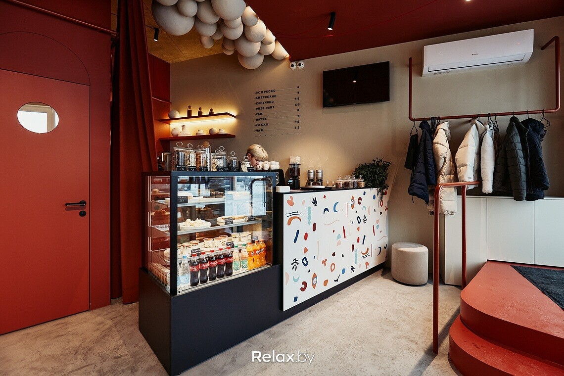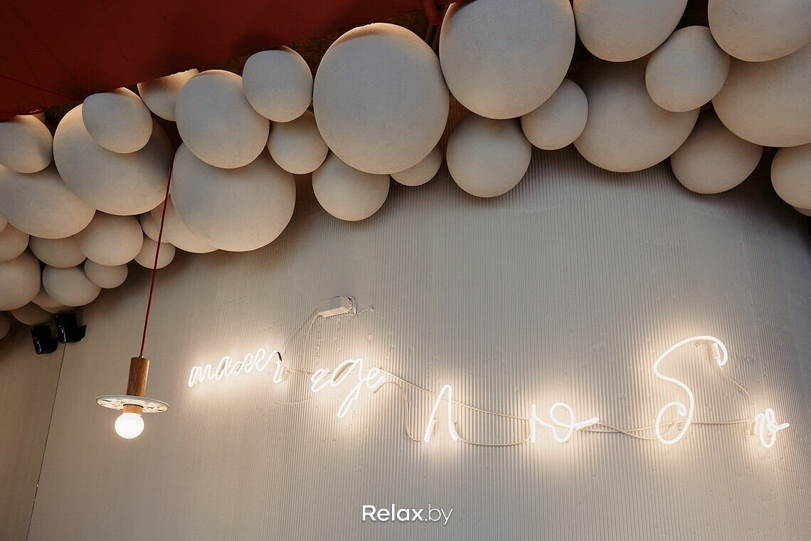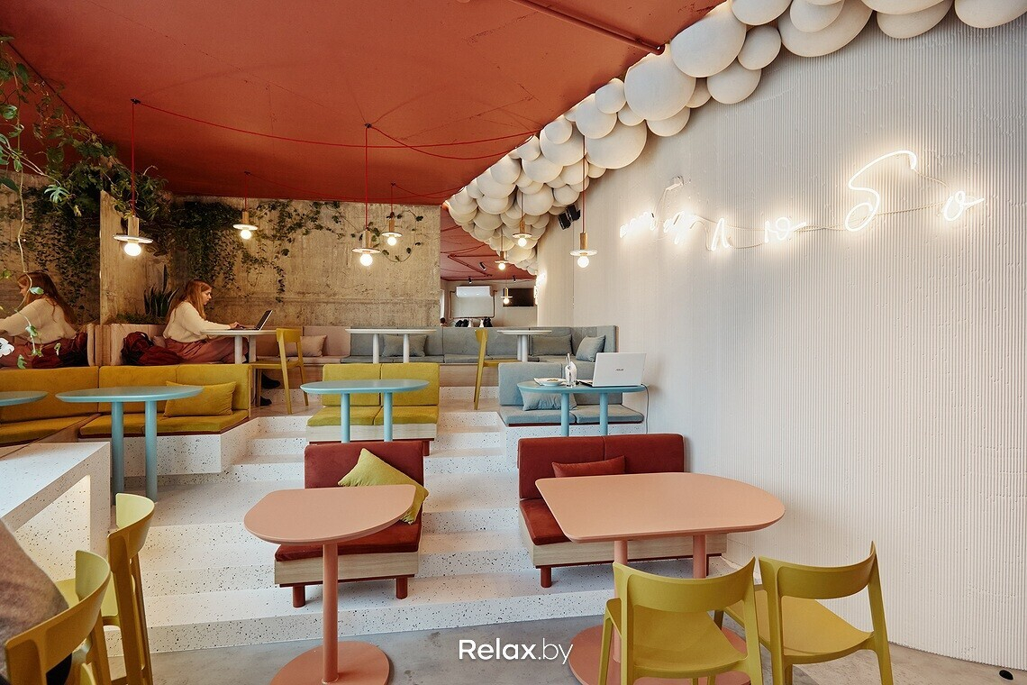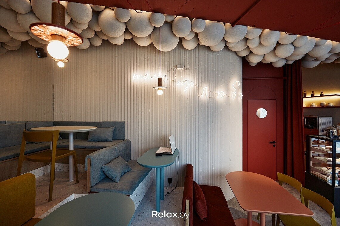 Зал нового места интересно зонирован: столики здесь размещаются на разных уровнях. Главная фишка интерьера — инсталляции из шаров, которые выглядят немного футуристично и сразу цепляют взгляд. Цветовая палитра достаточно яркая, но не пестрая, уводящие в глубокие, нежели в вызывающе сочные оттенки. В кафе много дневного света благодаря панорамным окнам.