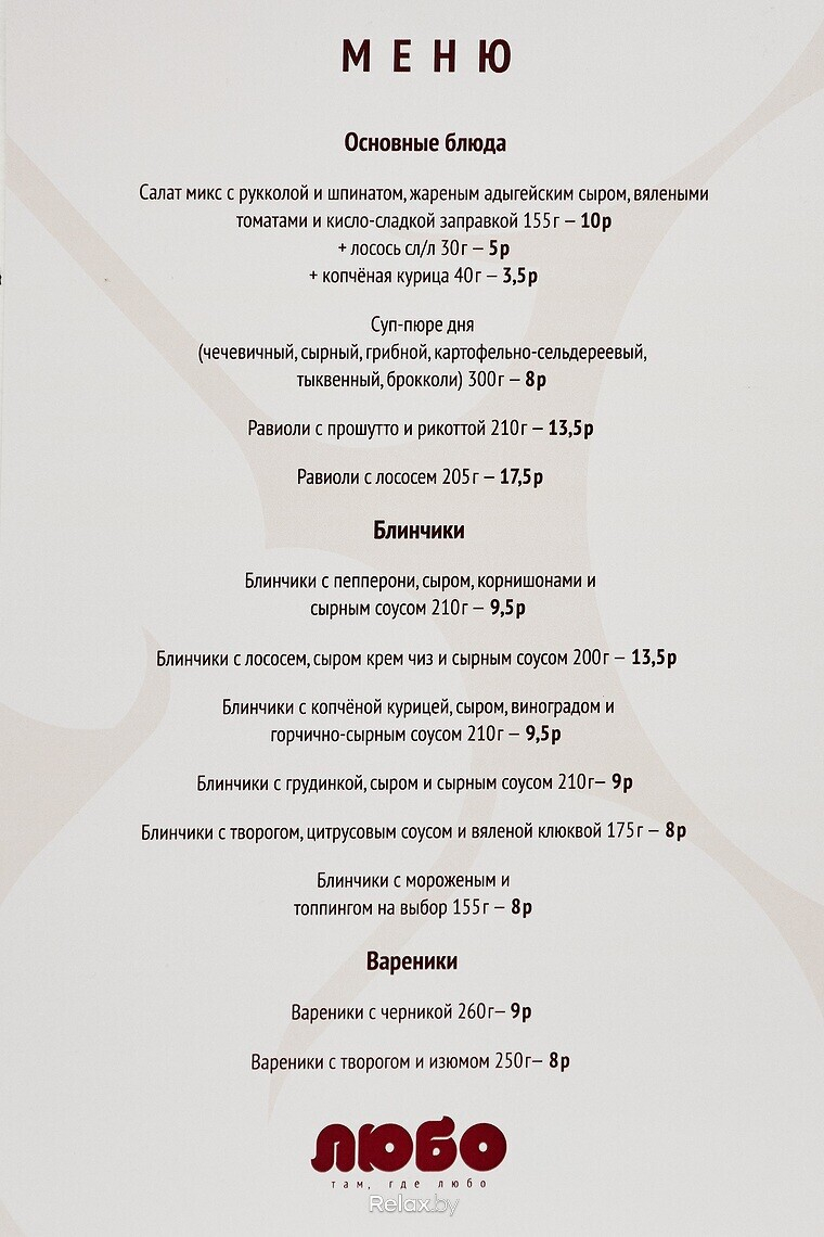 Цены в новом месте пока приятные, надеемся, что они сохраняться. Например, салат микс с рукколой, жареным адыгейским сыром, вялеными томатами и кисло-сладкой заправкой обойдется в 10 руб., к нему за дополнительную плату можно заказать лосось (5 руб.) или копченую курицу (3,5 руб.). За 8 руб. подают полезный суп дня (например, тыквенный или чечевичный). Равиоли с прошутто и рикоттой можно заказать за 13,5 руб., а с лососем за 17,5 руб. Отдельной категорией в «Любо» представлены блинчики: цены смотрите на фото ниже.