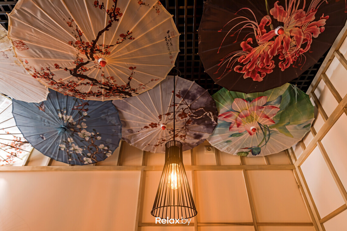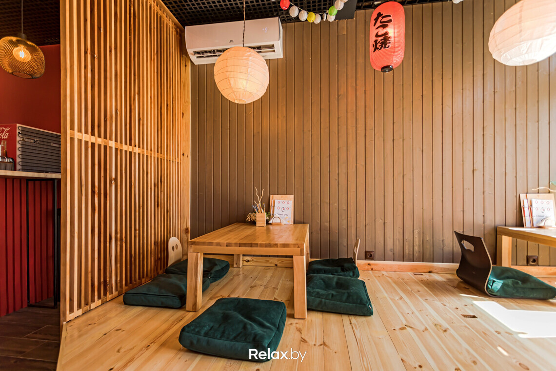 Зал заведения условно можно разделить на две зоны. Одна с фонариками, напоминающая фестивальную, и более традиционная японская зона с низкими столиками, где сидеть предлагается на подушках на полу.