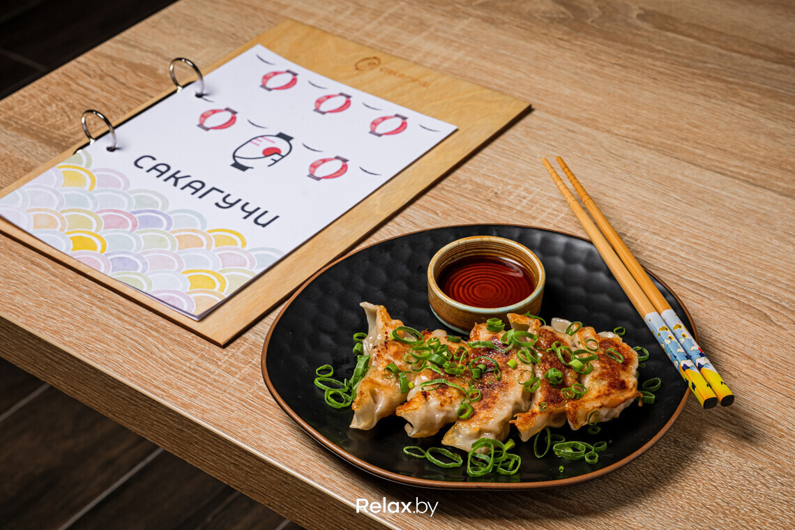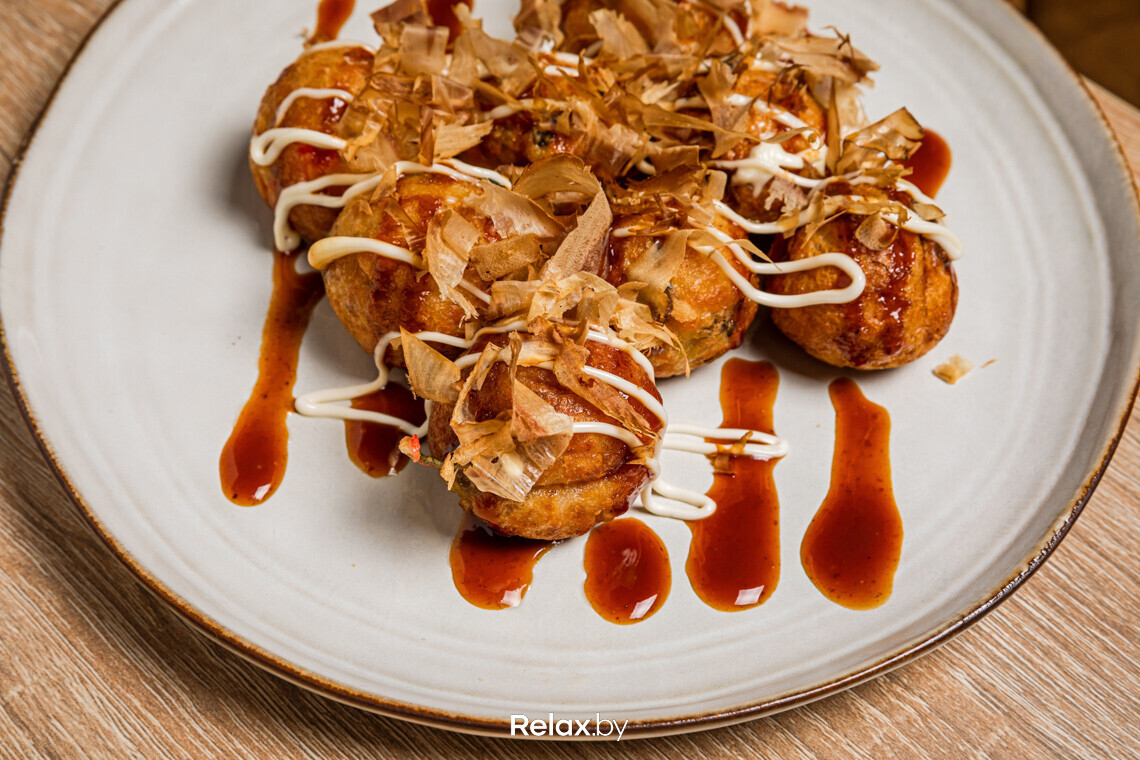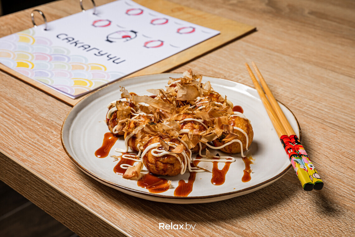 Что же касается еды, то помимо рамена фирменным блюдом в «САКАГУЧИ» можно назвать такояки. Это шарики из теста, которые готовятся не на воде, а на специальном бульоне, в результате чего получаются особенно ароматными. По оригинальному рецепту начинкой для этих шариков становится осьминог, но в Беларуси найти его в достойном качестве не удалось, поэтому остановились на мидиях.