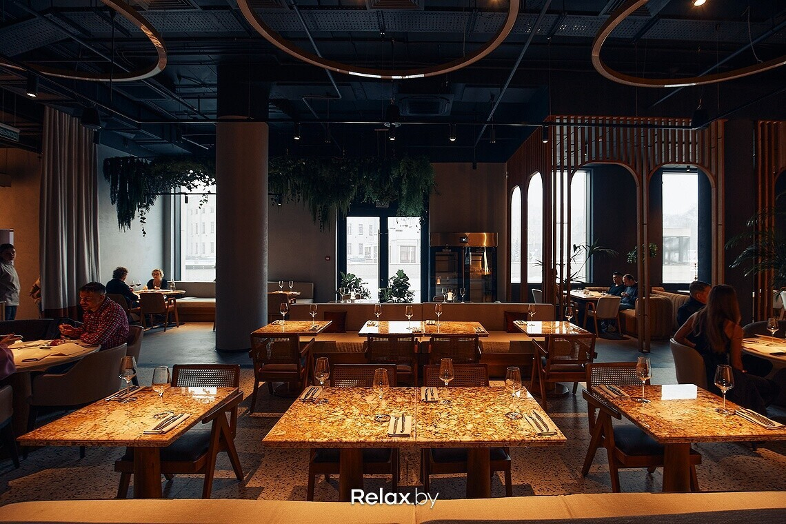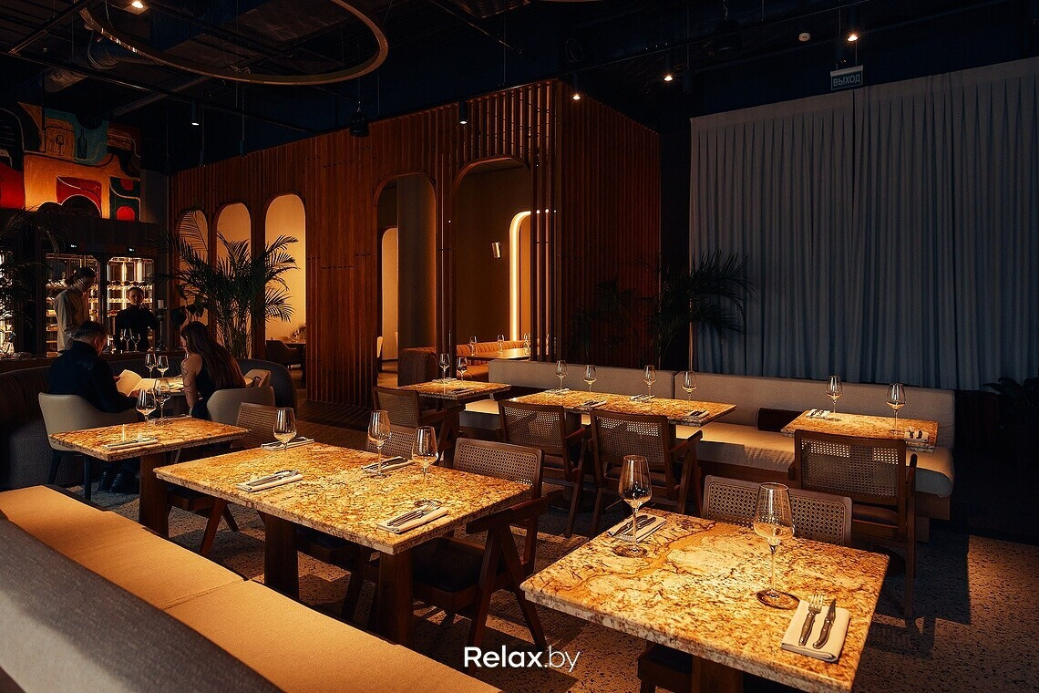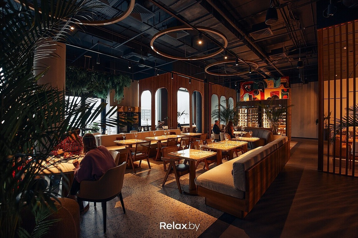 Бесспорный плюс пространства, которое досталось ресторану — высоченные потолки. Отчего кажется, что в заведении много воздуха, несмотря на камерность и ламповое освещение. Впрочем, окна в пол здесь также имеются: с Le cro cro откроется притягивающая взгляд панорама на цирк. Есть в зале и трендовые винтажные детали, и зелень, и акцентная картина. Про последнюю в своем Инстаграм-аккаунте Le cro cro от лица дизайнера рассказали так: