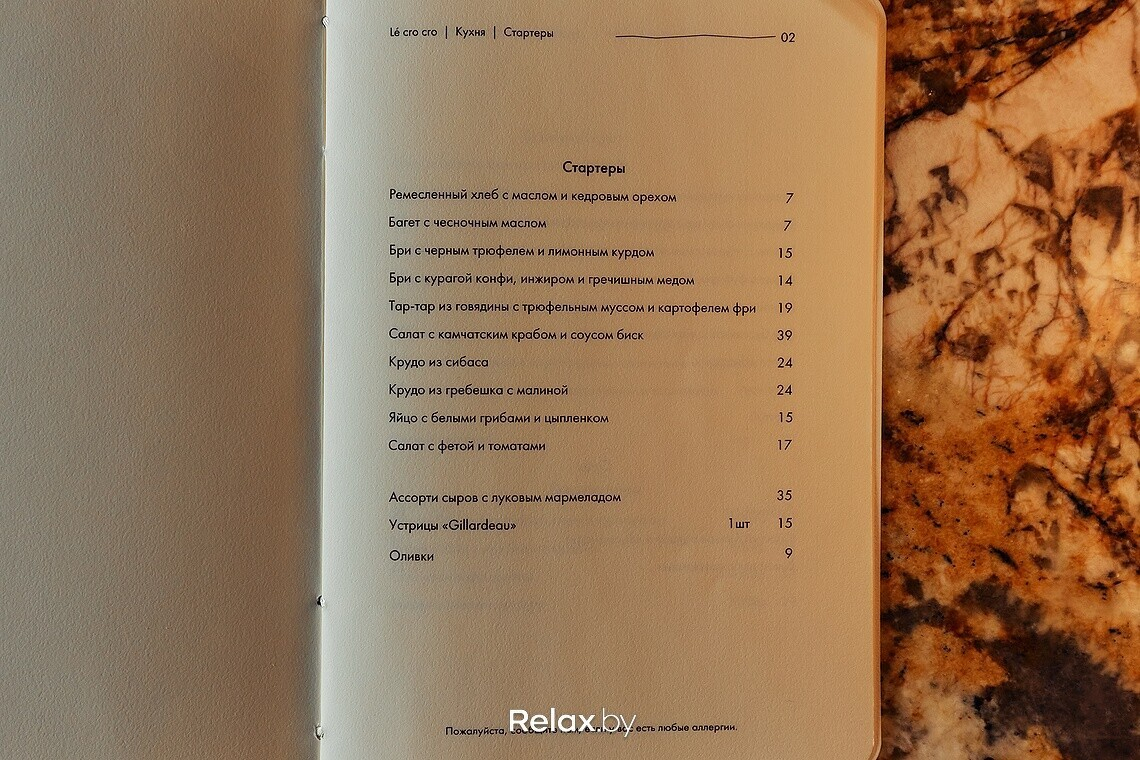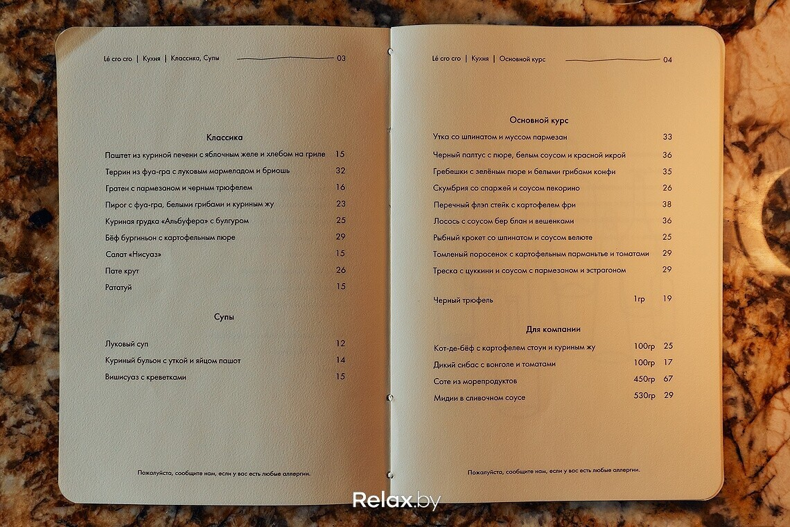 В меню ресторана представлены как классические, так и авторские позиции. Вы найдете здесь и луковый суп, и гратен, и вишисуаз, и мильфей на десерт. Чтобы упростить себе задачу, просто ищите в меню блок «Классика». Но если хочется чего-то новенького, то смело расспрашивайте официантов и пробуйте, например, салат с камчатским крабом, крудо из сибаса или террин из фуа-гра с луковым мармеладом и бриошь. Пока ресторан работает в тестовом режиме и цены вас приятно удивят, но не исключаем, что со временем они вырастут до так называемых «средних рыночных».