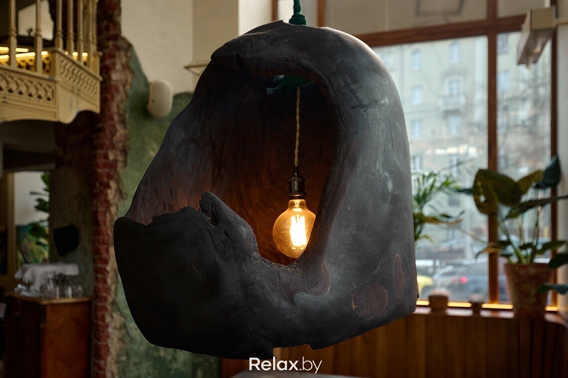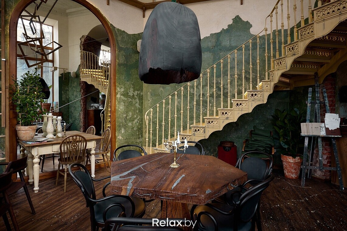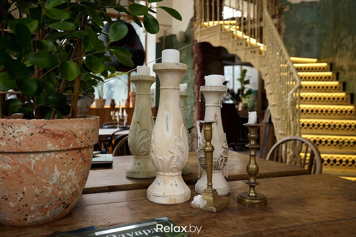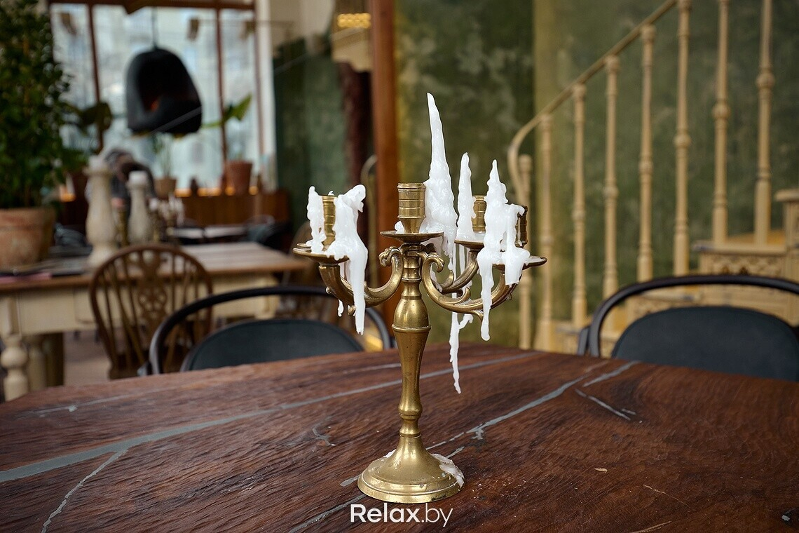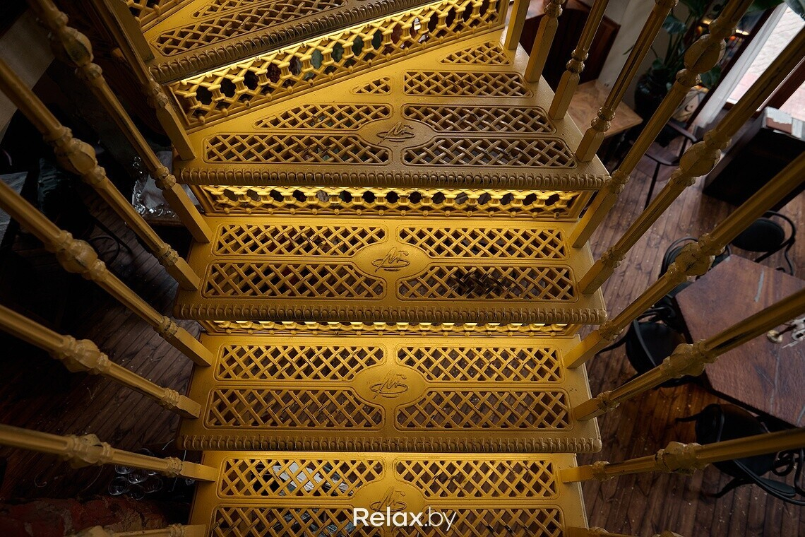 Когда заходишь в заведение, взгляд сразу приковывает к себе чугунная лестница, ведущая на второй этаж. Для заведения она была вылита под заказ. Обратите внимание, что на каждой ступени есть логотип ресторана. Также в интерьере много винтажа, который собирали по всей Беларуси, поэтому внимательно рассматривайте детали: столы, стулья, светильники, подсвечники… Другая же часть предметов делалась для ресторана под заказ, в том числе люстра из цельного куска дуба в центральном зале. О внимании к деталям можно судить по металлу в естественных трещинах дубовой столешницы, чтобы она лучше перекликалась с цветом приборов. Витражи во входной группе также авторские, а еще в заведении представлены картины белорусских художников, которые можно приобрести.
