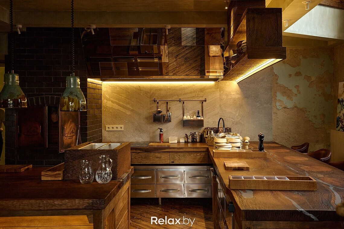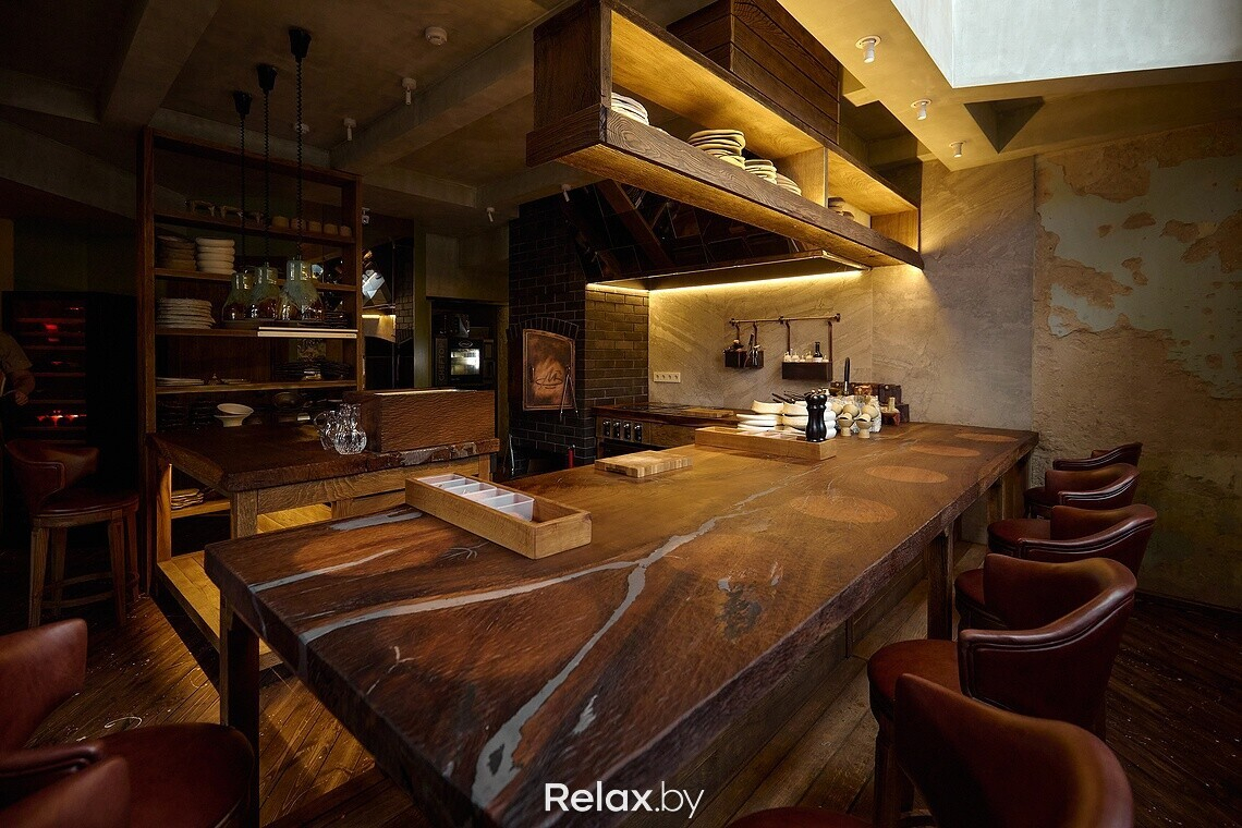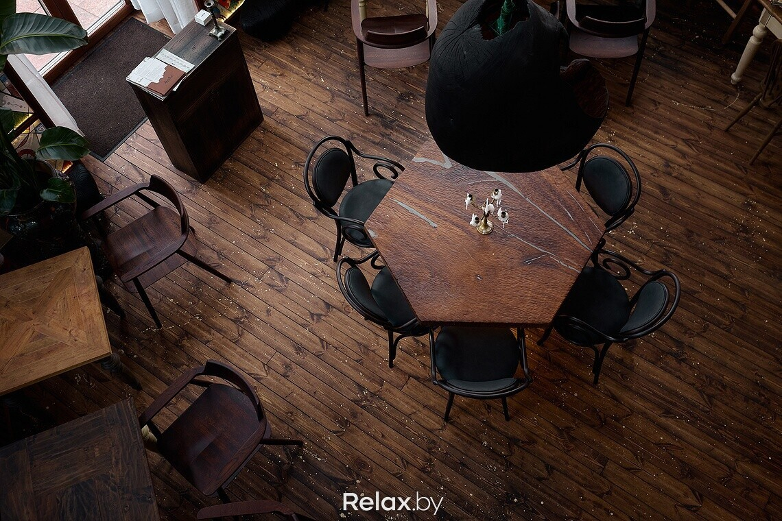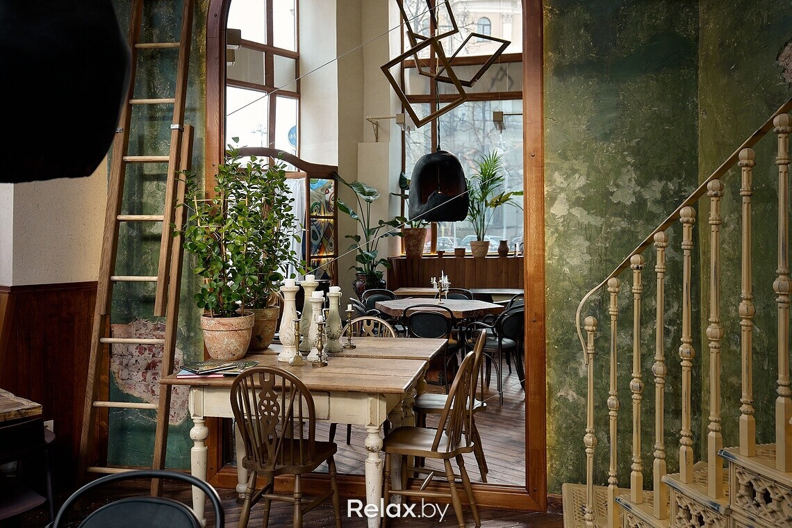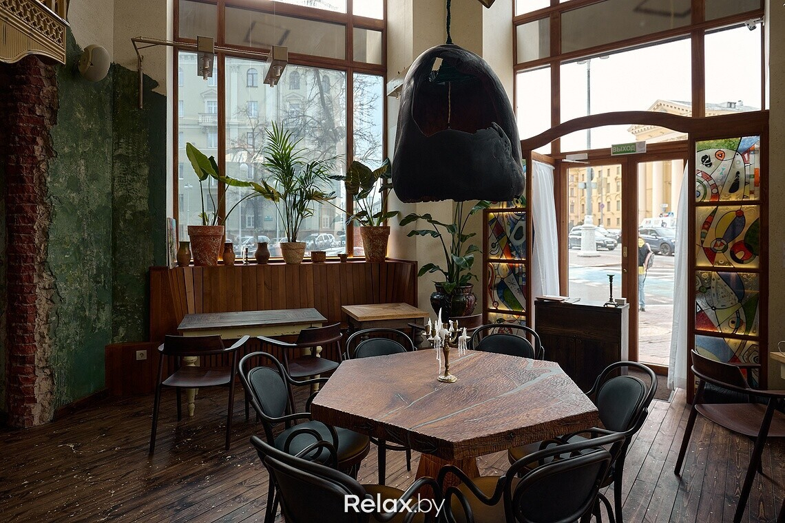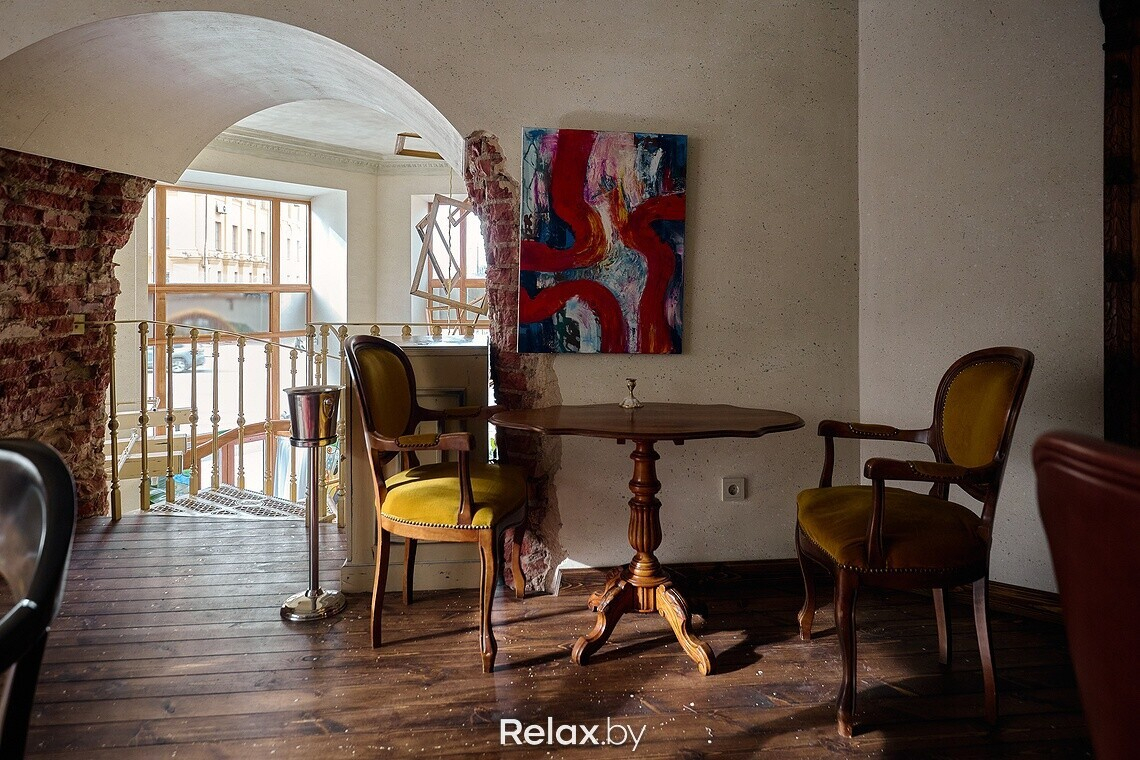 Когда заходишь в заведение, взгляд сразу приковывает к себе чугунная лестница, ведущая на второй этаж. Для заведения она была вылита под заказ. Обратите внимание, что на каждой ступени есть логотип ресторана. Также в интерьере много винтажа, который собирали по всей Беларуси, поэтому внимательно рассматривайте детали: столы, стулья, светильники, подсвечники… Другая же часть предметов делалась для ресторана под заказ, в том числе люстра из цельного куска дуба в центральном зале. О внимании к деталям можно судить по металлу в естественных трещинах дубовой столешницы, чтобы она лучше перекликалась с цветом приборов. Витражи во входной группе также авторские, а еще в заведении представлены картины белорусских художников, которые можно приобрести.