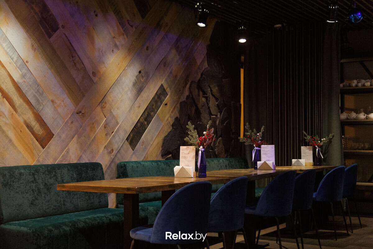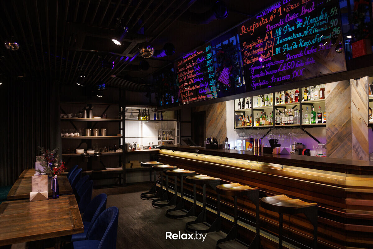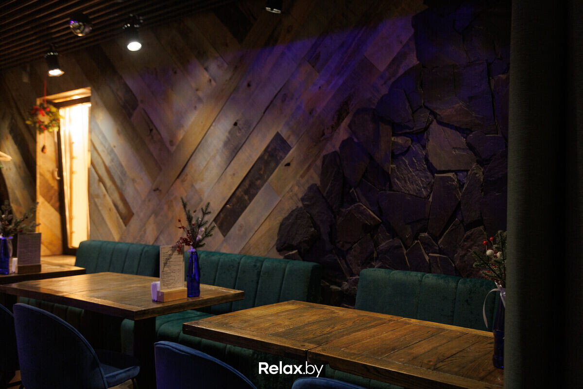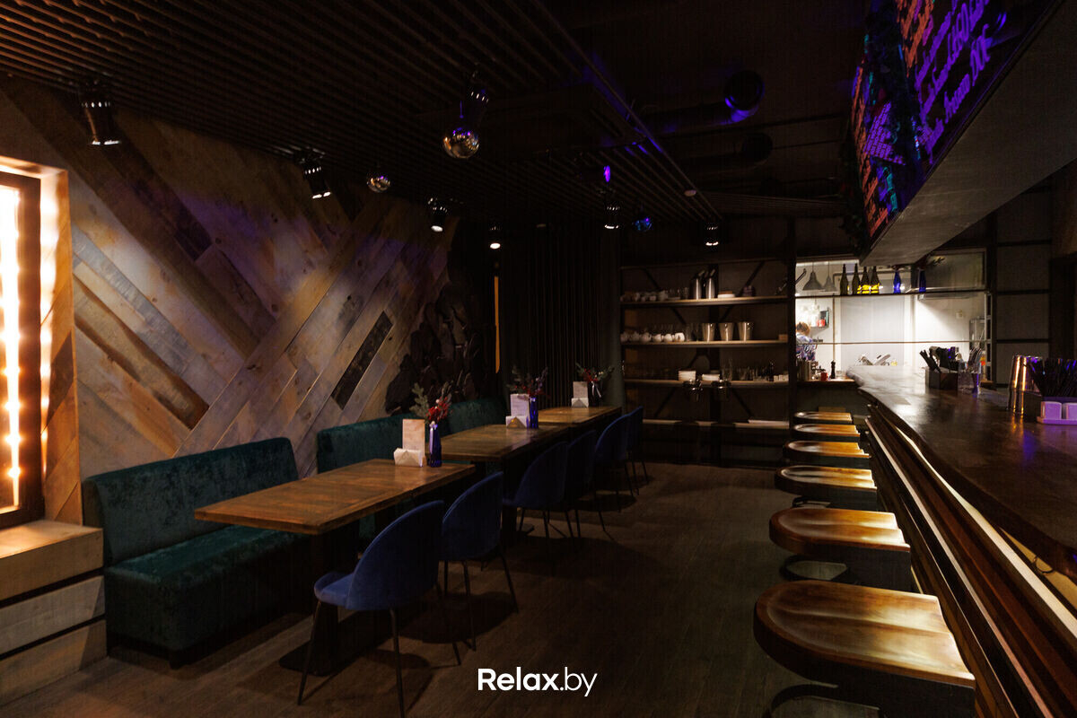 Интерьер Hedonist сочетает два ключевых элемента — дерево и темный камень. Барную стойку и стулья делались под заказ местным мастером, барное меню в заведении органично вписано на зеркалах над баром. Повышают градус стиля мягкие темно-зеленый диваны и яркие прожектора, направленные на столы.