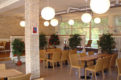 Не оставит посетителей равнодушными и интерьер ресторана. Светлые маленькие столики, легкие плетеные кресла, много декоративных растений создают атмосферу летнего курортного кафе. Теплая обстановка несомненно заставит вас позабыть о наступающей зиме. Также особенно любопытные или крайне придирчивые гости смогут понаблюдать за приготовлением заказанных блюд, ведь уголок повара находиться неподалеку от столиков посетителей. Те, кто решат забежать в новое заведение и быстро перекусить в одиночку, смогут расположиться за барной стойкой. Еще одна приятная сторона кафе в том, что оно решило придерживаться европейского уровня. «Пицца и пельмени» рассчитано на людей, заботящихся о своем здоровье, поэтому курить в нем запрещено.