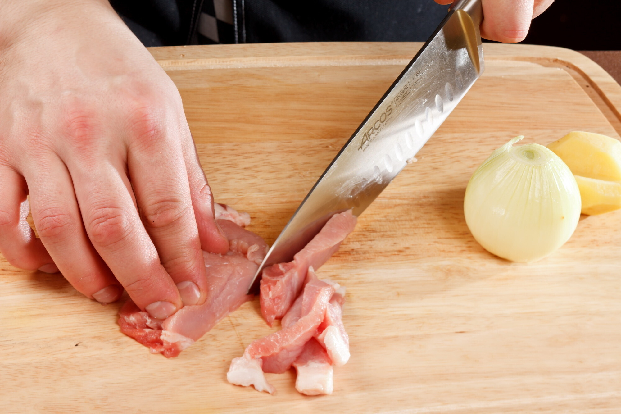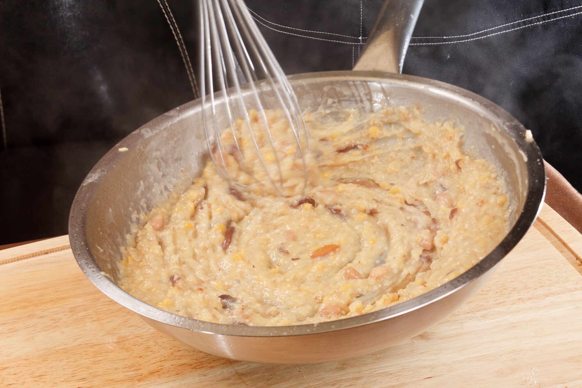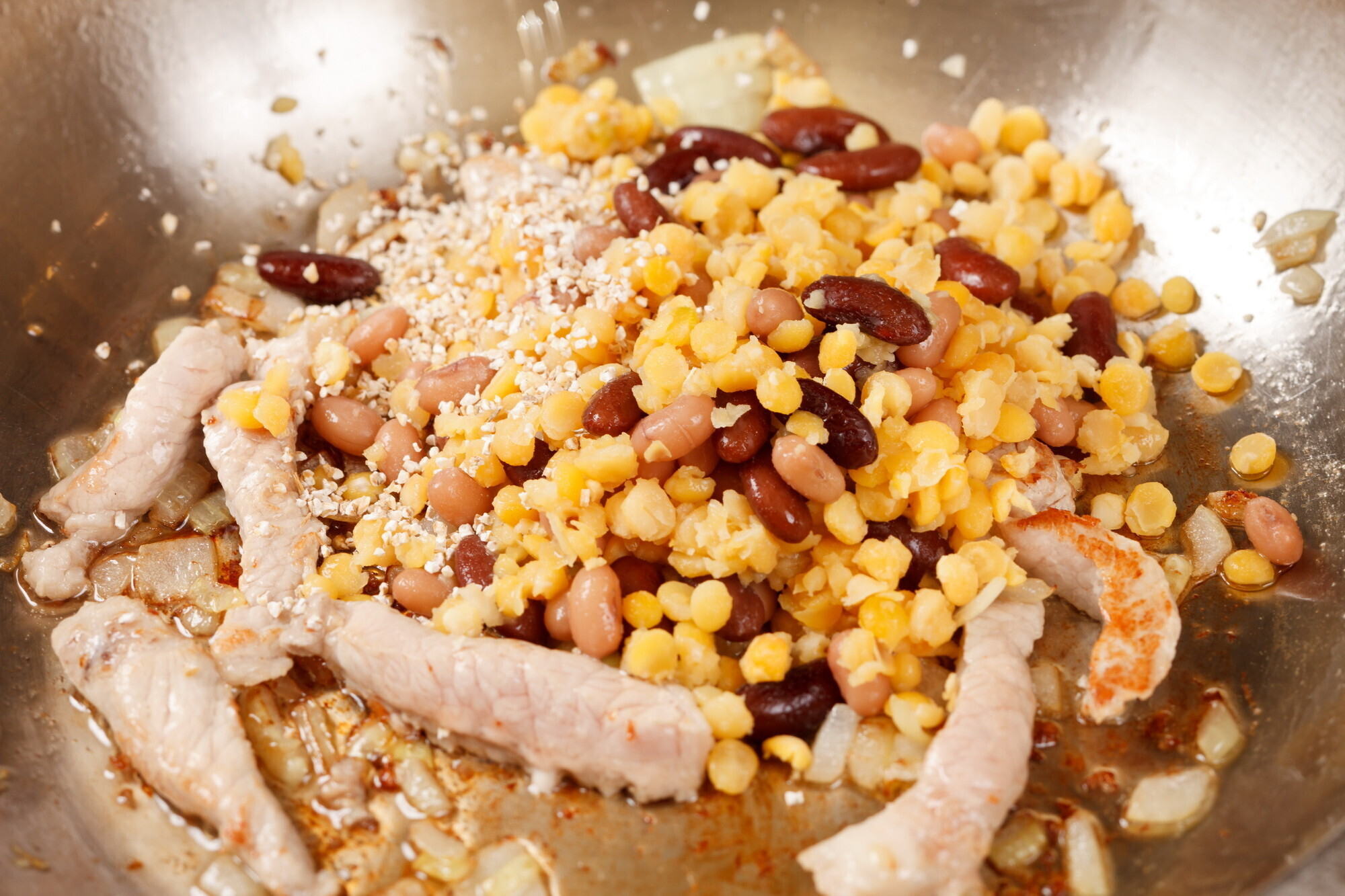 Свинину и лук обжарить, добавить крупу, горох, фасоль (бобовые предварительно замочить в холодной воде на 6-8 часов), залить бульоном и тушить до готовности мясопродуктов. Затем их вынуть и, помешивая, ввести тёртый картофель. Варить, мешая, до готовности (чтобы перестал чувствоваться крахмал).