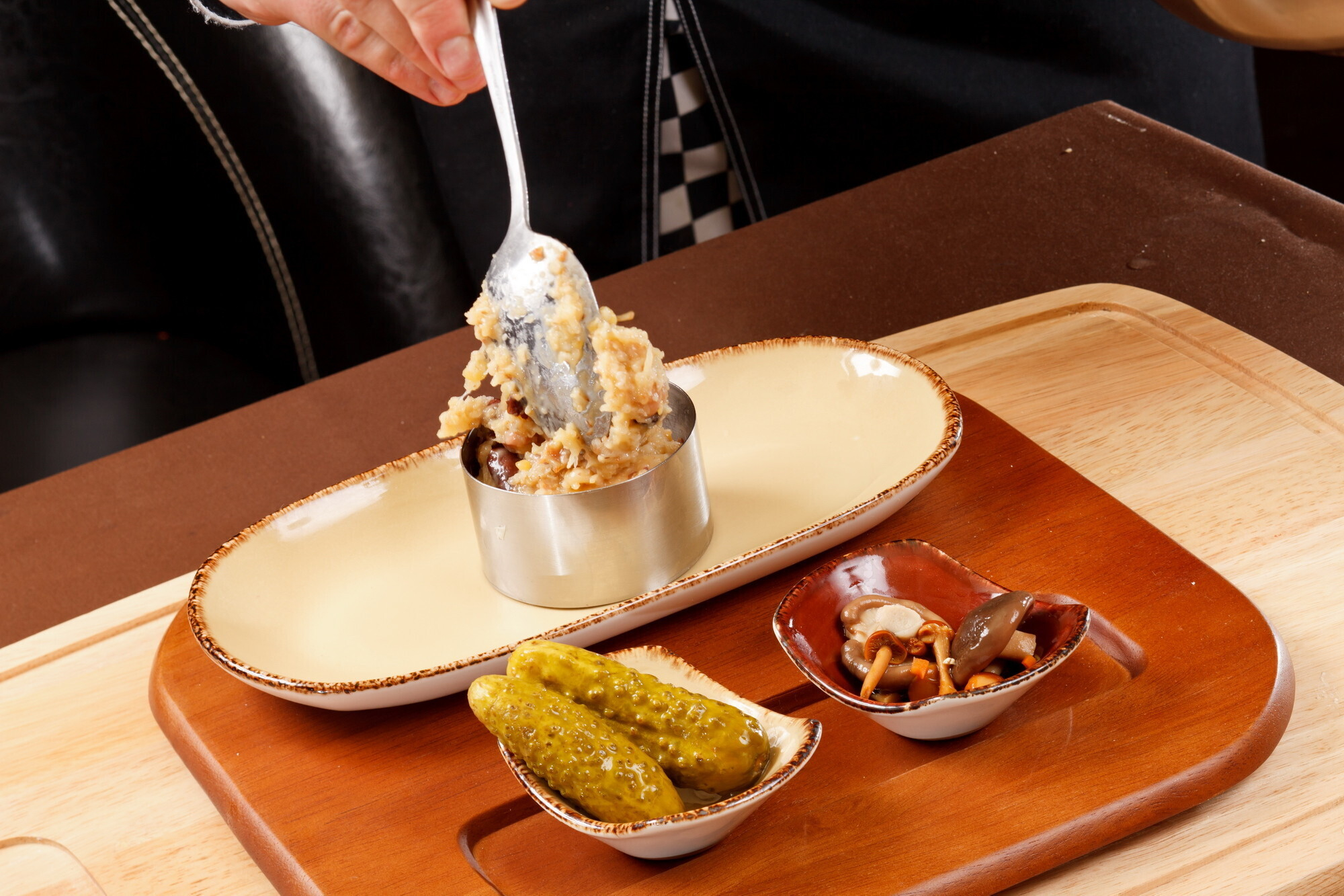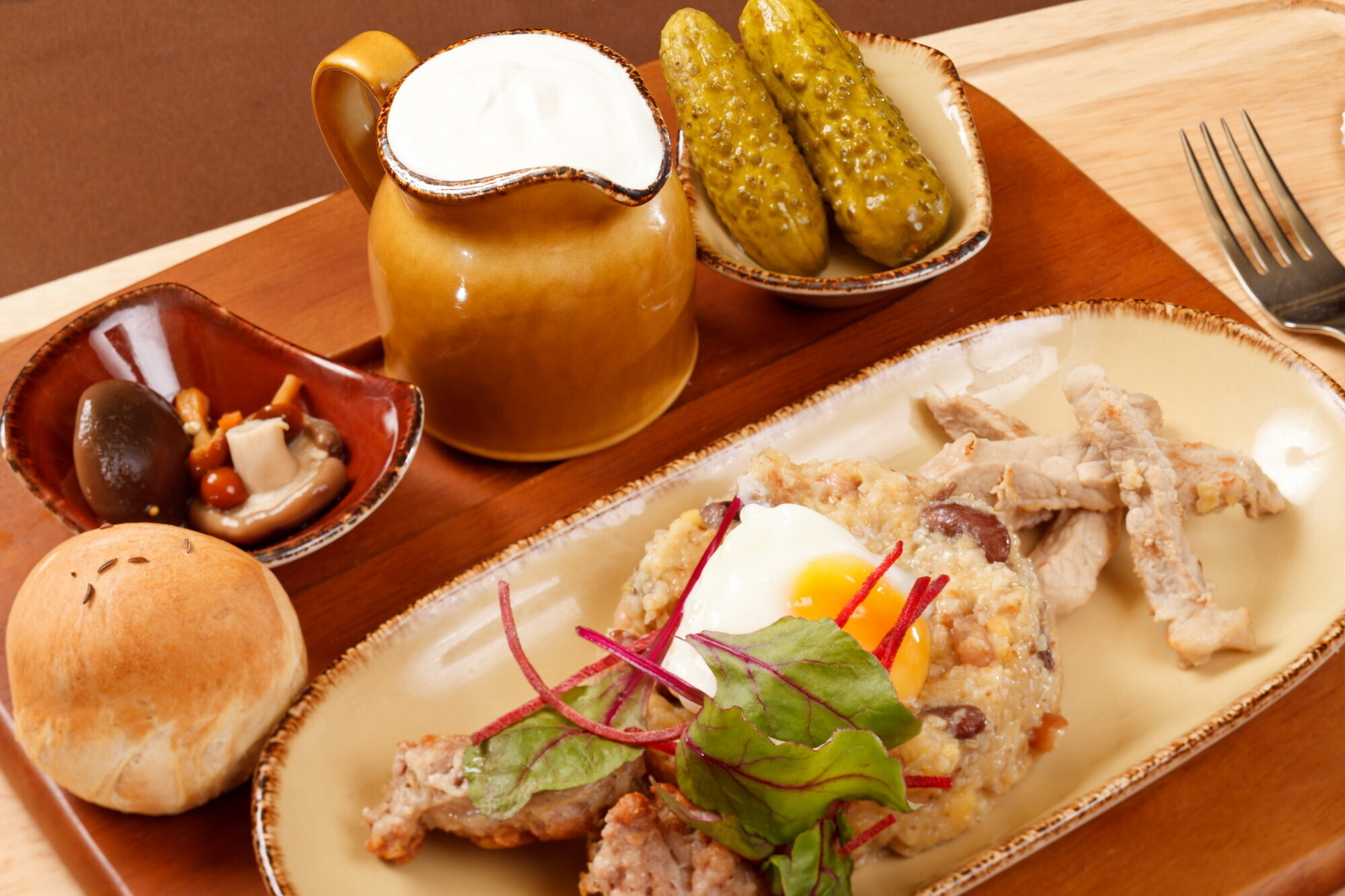 Подавать с солёными огурцами, хлебом, зеленью, грибами, сметаной и яйцом «в мешочек».