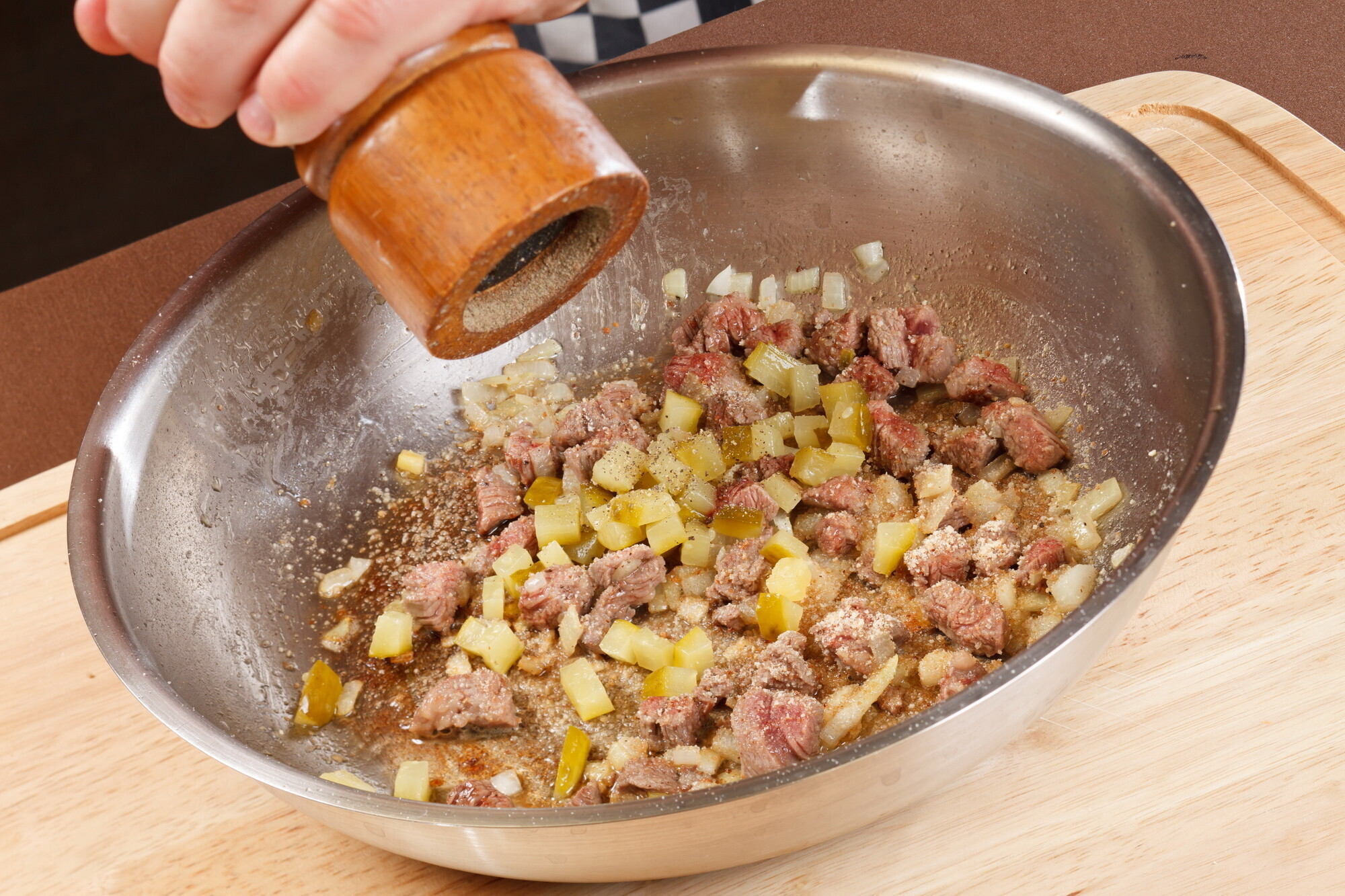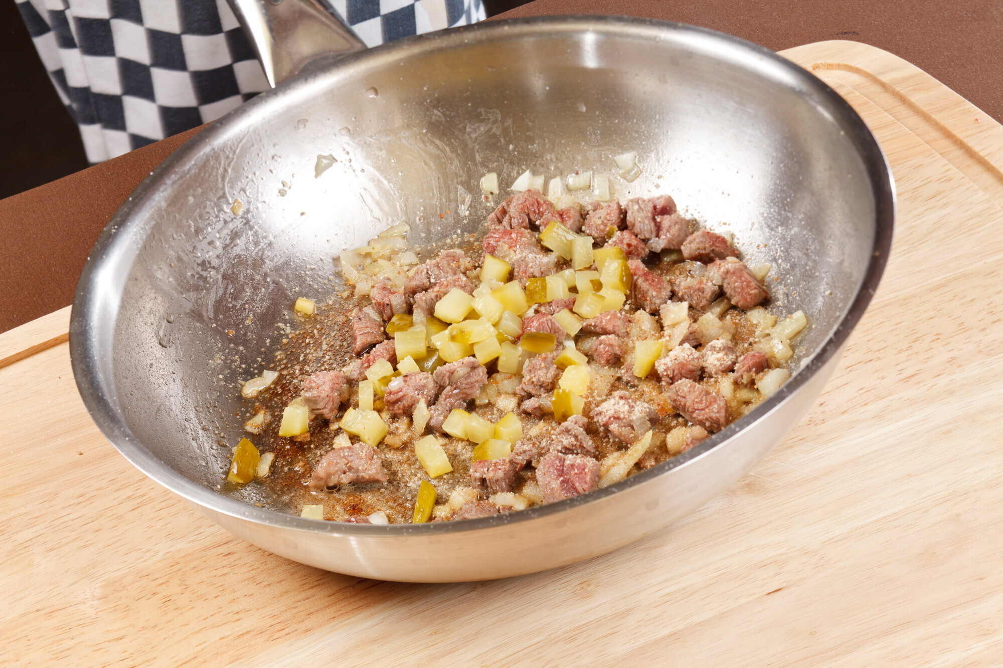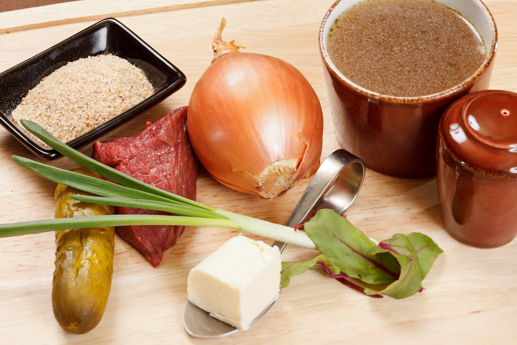 Нарезаем кубиками лук и обжариваем на масле до полупрозрачного состояния. Добавляем нарезанное кусочками мясо и жарим 1-2 минуты, посыпаем панировочными сухарями, обжариваем еще 30 секунд. Добавляем огурцы, помешиваем, заливаем небольшим количеством бульона и тушим до загустения и готовности блюда (пока бульон не выпарится). Подаем с зеленью, хлебом, грибами и чашкой горячего бульона.