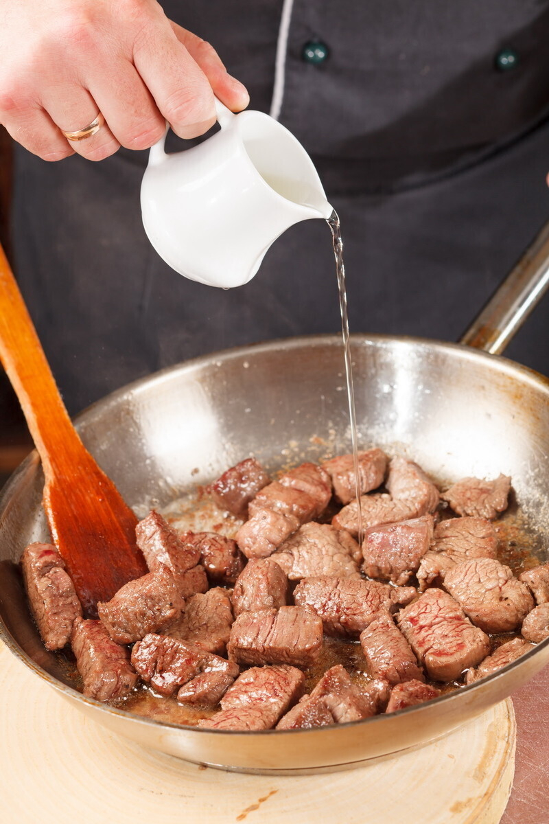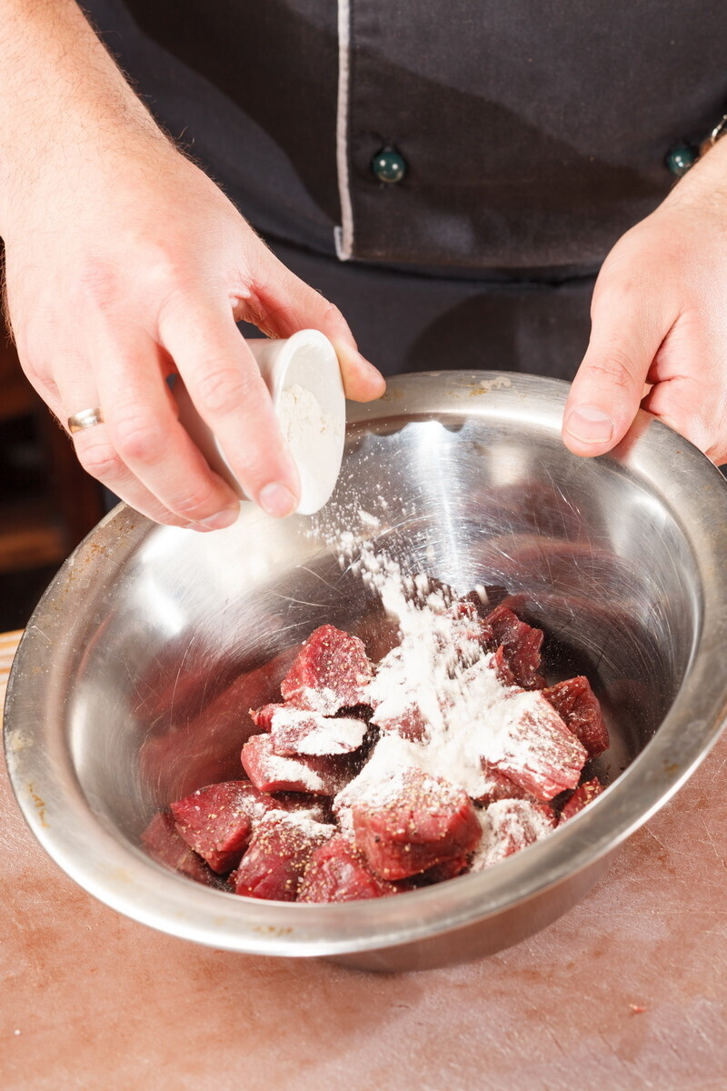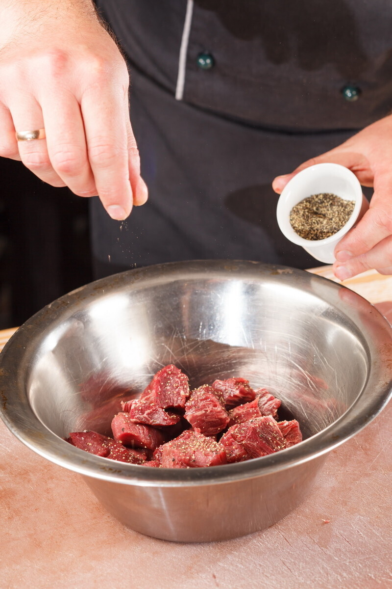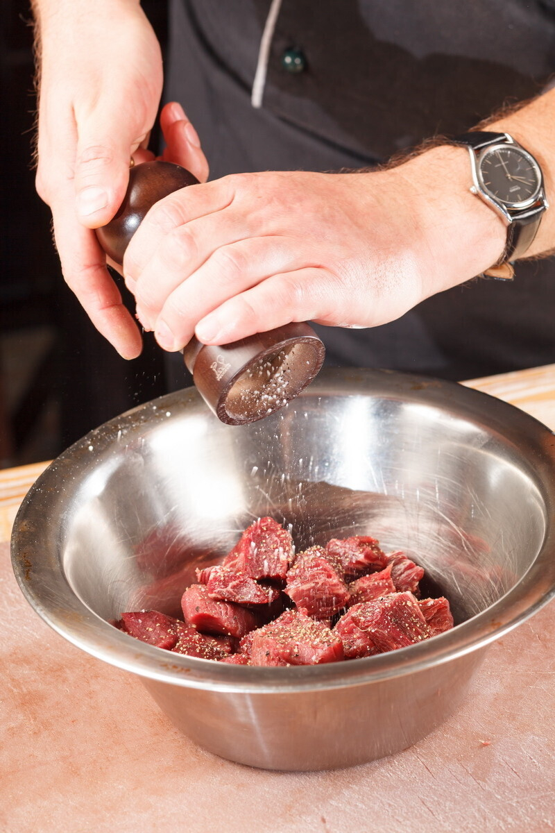 • мясо нужно нарезать одинаковыми кусками (предпочтительный размер около 5 см.) и оно должно быть очень сухим. Тщательно вытираем бумажными кулинарными полотенцами. Солим, перчим ДО того, как мы положили в кастрюлю.