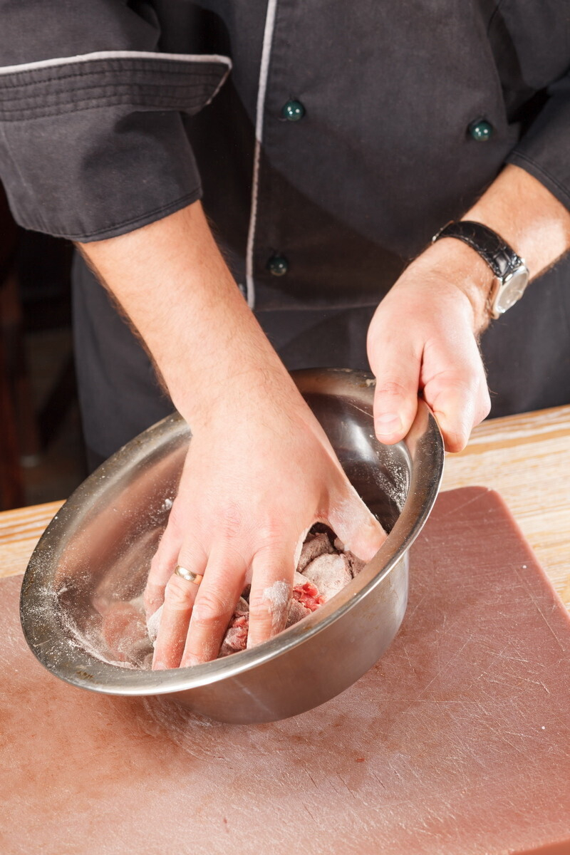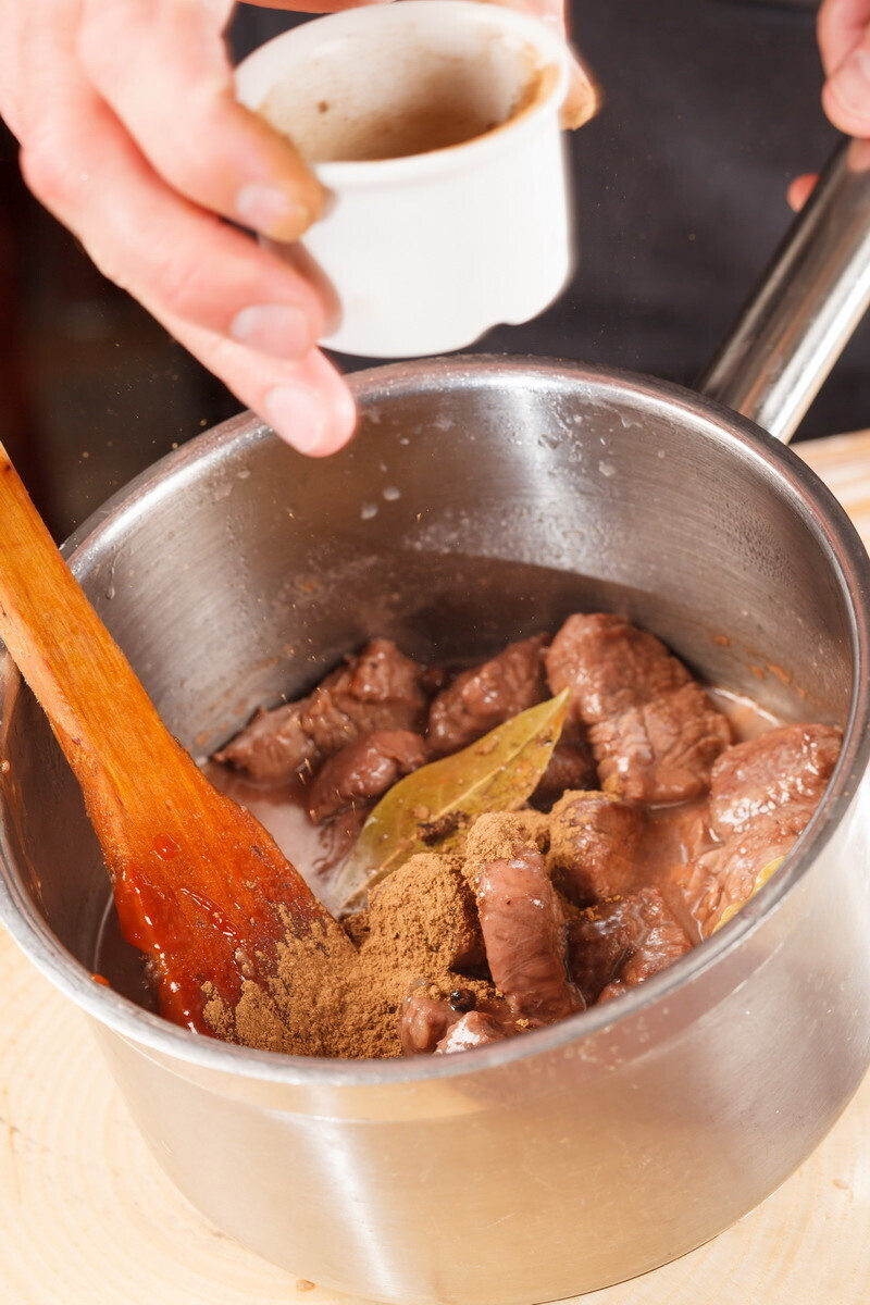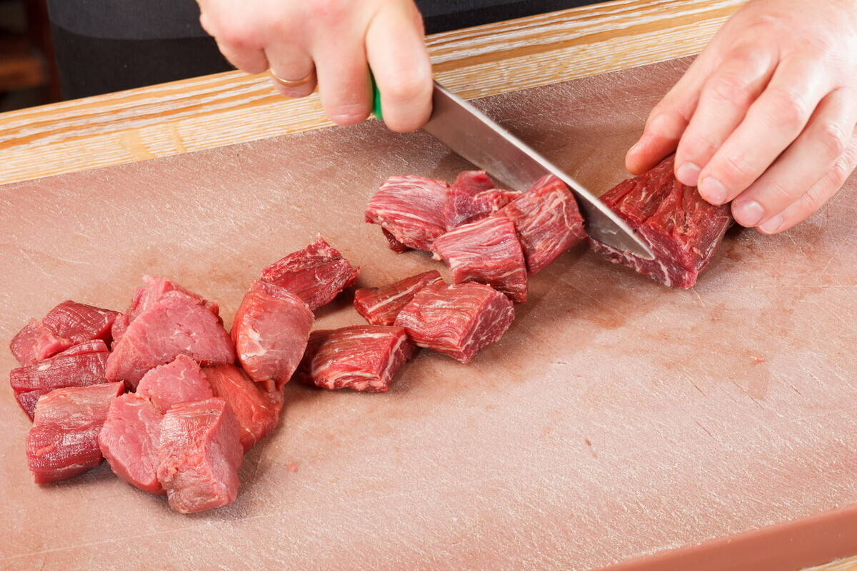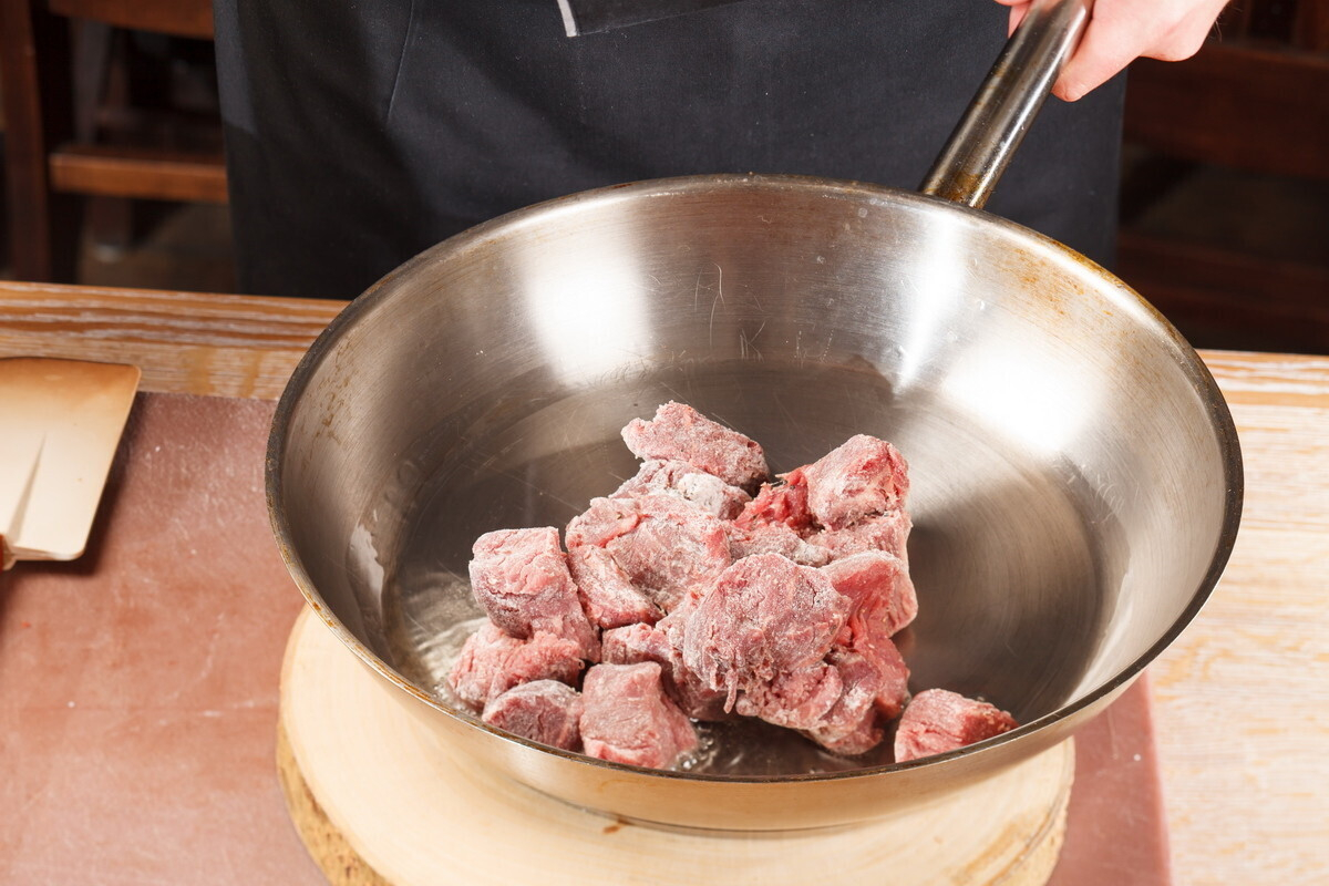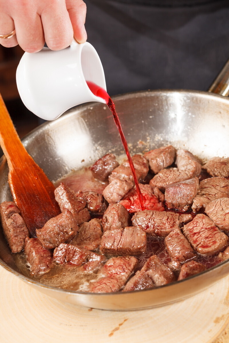 • мясо нужно нарезать одинаковыми кусками (предпочтительный размер около 5 см.) и оно должно быть очень сухим. Тщательно вытираем бумажными кулинарными полотенцами. Солим, перчим ДО того, как мы положили в кастрюлю.