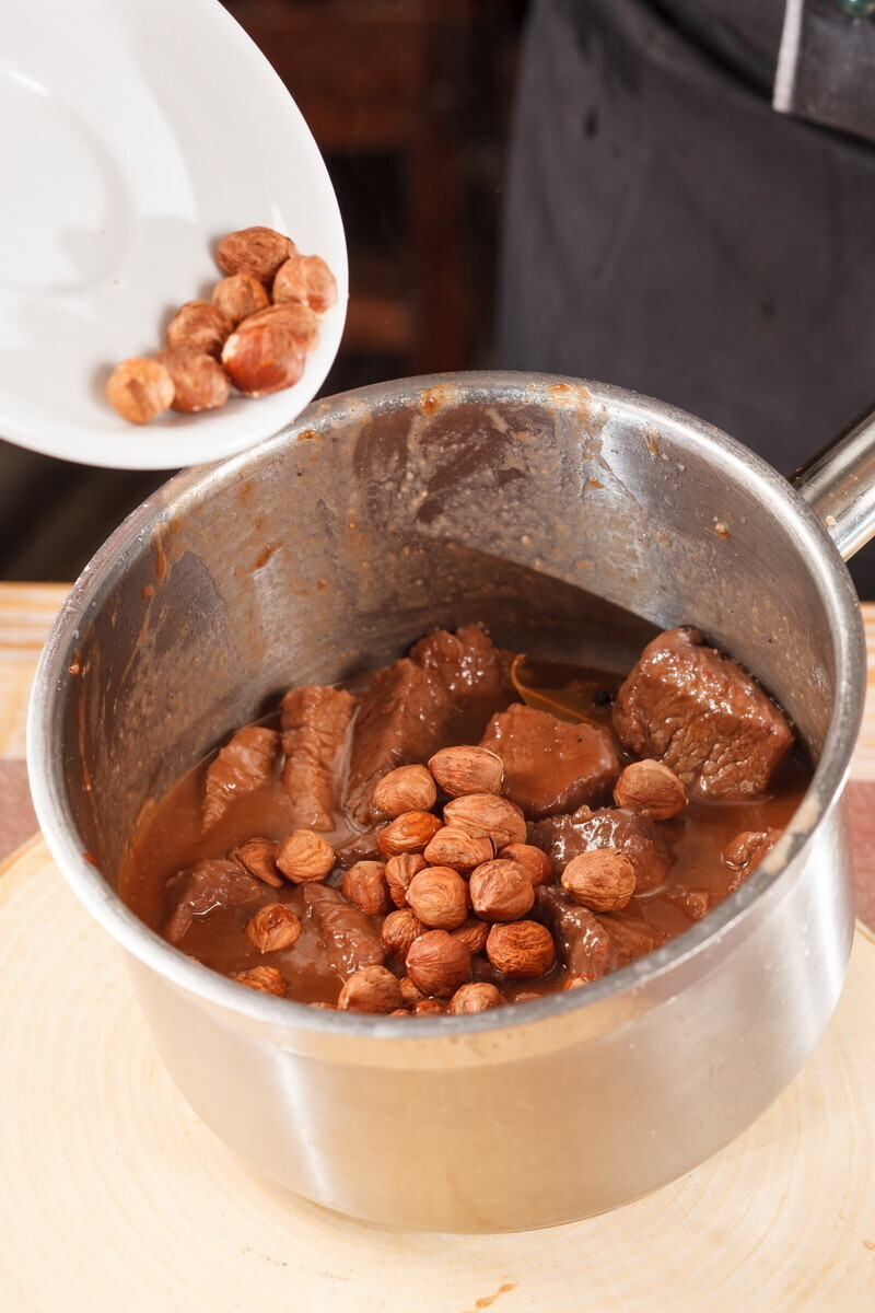 Посыпать мукой, обжарить на сильно разогретом жире, залить рассолом и вишневым соком, тушить на маленьком огне под крышкой. Перед концом тушения добавить орехи и специи.