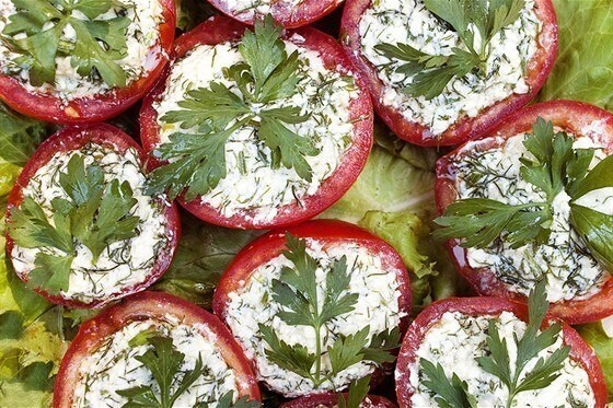 Такая суперлегкая закуска, как фаршированные томаты, выглядит ничуть не хуже «жирненьких» бутербродиков с колбасой и маслом.