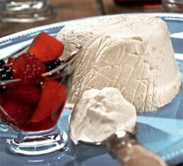 Сливки взбейте в густую пену. Достаньте творог из формочек, осторожно снимите пленку и выложите на тарелки. Подавайте с ягодным соусом и взбитыми сливками.