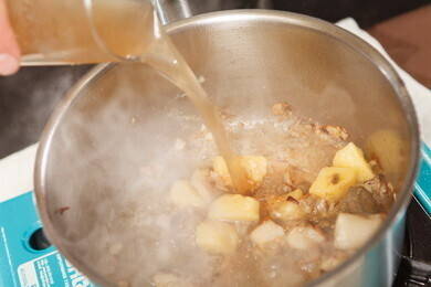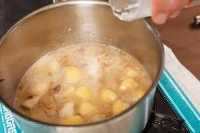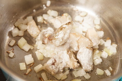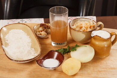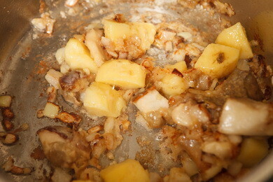 Лук мелко нарубить и слегка обжарить. Грибы нарезать кубиком, обвалять в муке и добавить к луку. Продолжать обжаривать 1-2 минуту. Затем добавить картофель. Немного обжарить, добавить грибной бульон, отжать капусту и варить 7-10 минут. Довести до вкуса. Подавать вместе со сметаной.