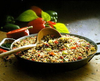 Ставим вариться рис и параллельно нарезаем овощи. Цуккини режем тонкими ломтиками, а помидоры – кубиками. Так же можно порезать чеснок и лук. После этого обжаривается на масле цуккини и сладкий перец, к ним добавляется лук с чесноком и еще раз обжаривается. Затем туда кладется сваренный рис, помидоры и тушится еще 5 минут. Полученное блюдо приправляется цедрой, перцем и зеленью. И вот еда готова!
