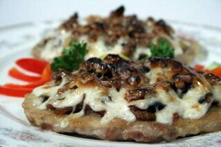 Свинину нарезать кусочками по 100 грамм, отбить их и придать форму, после чего обвалять в муке и прожарить с обеих сторон на растительном масле до состояния готовности. Готовые кусочки выложить на противень. Затем в растительном масле обжарить мелконарезанный лук, выложить на жаренную свинину. Нарезать чернослив и тоже выложить на свинину, залить все майонезом. Украсить грецким орехом и отправить в духовку до готовности.