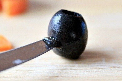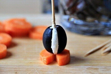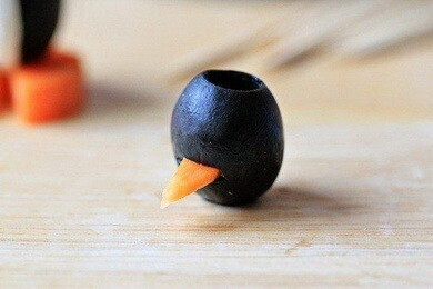 Приготовление: Морковь нарежьте кружками (18 штук). Вырежьте небольшой треугольный кусочек из каждого кружка моркови для будущих ножек пингвинов. Возьмите мягкий сливочный сыр. Вырежьте небольшую щель сверху донизу вдоль больших маслин и заполните вырезанные отверстия сыром. Затем закрепите маслину на морковке при помощи зубочистки. Затем вырежьте небольшие отверстия в каждой маленькой маслине. Вставьте треугольные части моркови в отверстие. Нос готов! Установите маленькую маслину на зубочистку.