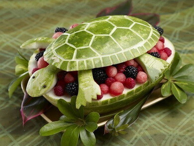 Художественная резьба по овощам и фруктам, а именно карвинг, еще один оригинальный способ оживить ваш праздничный стол. Для карвинга вы можете использовать как простые ножи, так и набор специальных инструментов, которые сейчас можно купить практически в любом магазине с кухонными принадлежностями. Немного тренировок, мастер-классов (к примеру, резьба по арбузу) и времени — и чудесное украшение для стола готово!