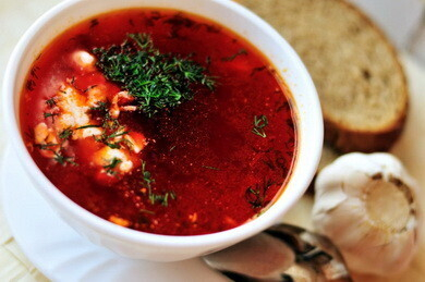 Способ приготовления: нашинковать морковь, свеклу (желательно крупно) и корень петрушки. Всю массу положить в подходящую кастрюлю, залить холодной водой и варить 15 минут. Затем добавить туда очищенный и нарезанный картофель, а также нашинкованную четвертинку капустной головки. Когда картофель сварится, добавить в кастрюлю свекольный квас, а также предварительно обжаренный на подсолнечном масле до золотистой корочки репчатый лук. Предварительно замоченные на всю ночь сушеные грибы, отварить до готовности в той же воде, в которой они отмокали. Можно этот же грибной отвар добавить в борщ, что придаст ему дополнительный аромат. Вынутые из отвара грибы мелко порезать и смешать с луковой зажаркой. Добавить в суп. Заправлять нежирной сметаной.