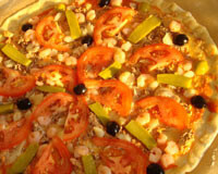 пюре тунец и выкладываем тонким слоем на тесто. После этого рисуем круг из нарезанных помидоров, внутри него кладем филе семги, палтуса или лосося, креветки, маринованные огурчики, маслины, оливки, кукурузу, и все это вкусное счастье покрываем плотным слоем натертого на терке сыра.