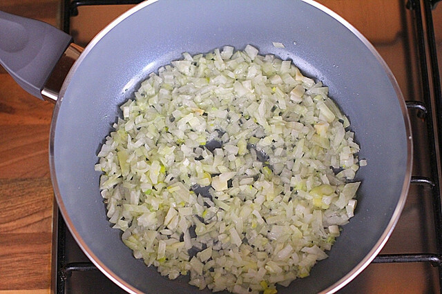 - 02 Лук следует обжарить до полуготовности на растительном масле.