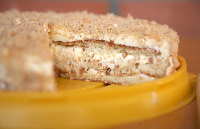 - 07Разделяем корж на равные части. Смазываем их нежным сметанным кремом и украшаем персиками. Оставляем торт пропитываться на час.