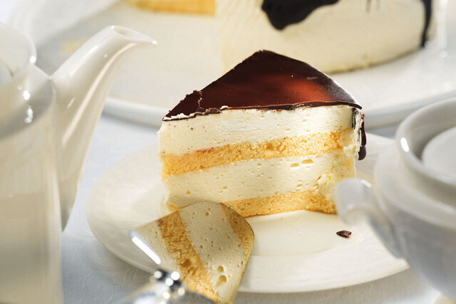 - 12Достаем застывший торт из холодильника и перекладываем из формы на блюдо.