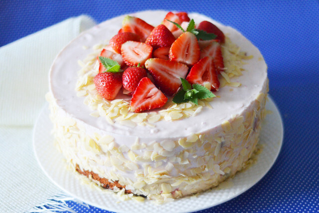 - 06Крем для бисквитного торта готовится следующим образом: свежую или замороженную клубнику протираем или перемалываем в блендере. Сливочное масло взбиваем с сахаром и протертыми ягодами.