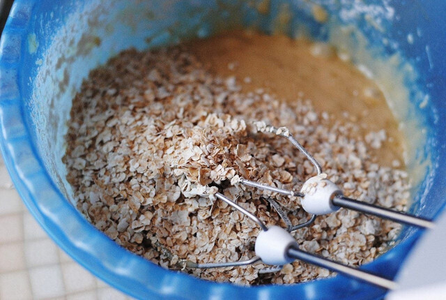 - 03В отдельную миску высыпаем овсянку, соль, соду и муку. К ним добавляем морковно-масляную массу, туда же отправляем кусочки шоколада и орехи.