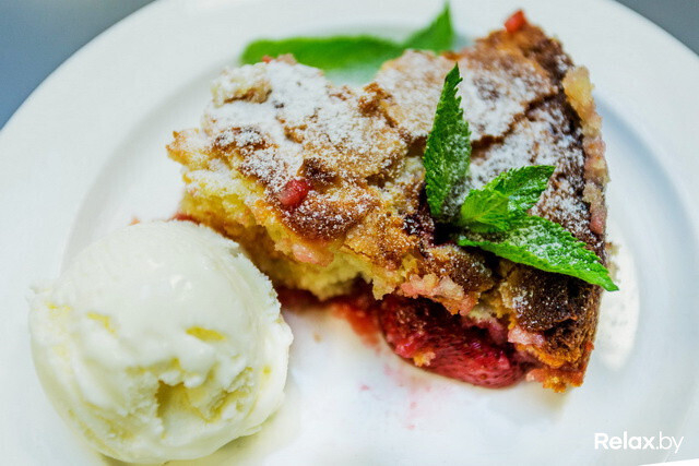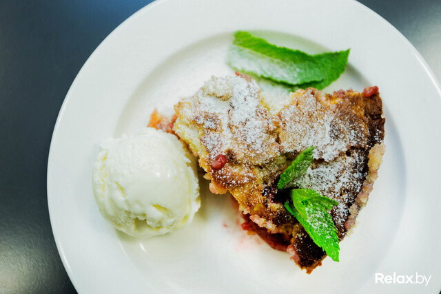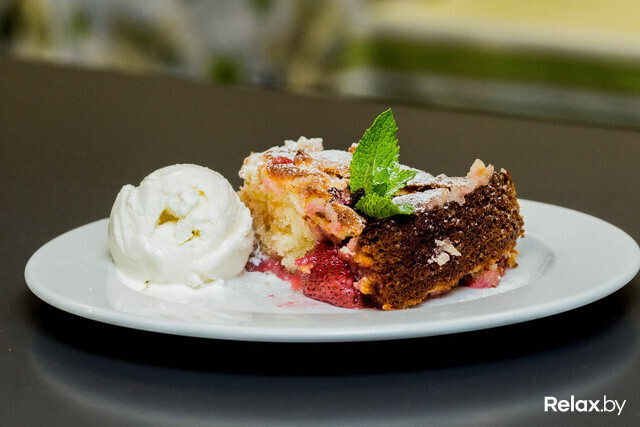 Перед подачей шеф-повар украсил пирог мятой и мороженым. Дома Вы можете экспериментировать и украшать пирог даже свежей клубникой! Этой ягодой Вы выпечку не испортите.