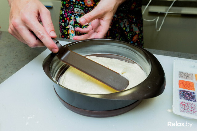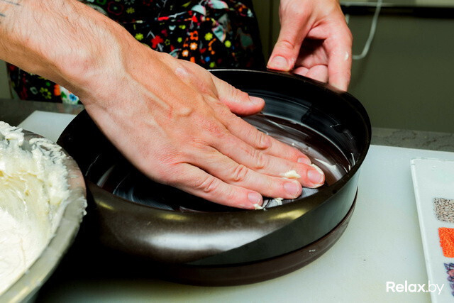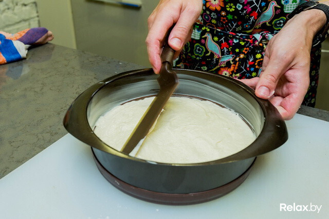 - 06Поверхность будущего пирога необходимо разровнять. В домашних условиях это легко можно сделать с помощью ложки.