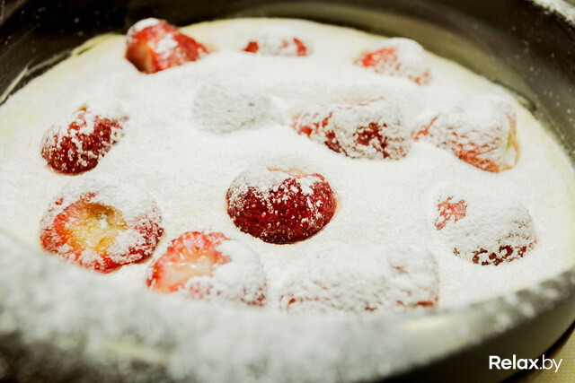 - 07В тесто кладем клубнику и слегка вдавливаем. Сверху посыпаем сахарной пудрой для красоты.