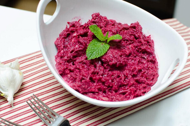 - 08Приготовьте заправку: чеснок пропустите через пресс и добавьте к оливковому маслу и горчице. Тщательно перемешайте ингредиенты и полейте заправкой салат.