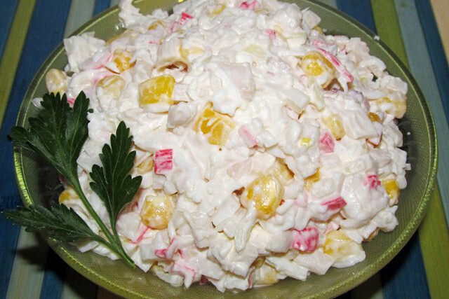 - 05Салат нужно выложить слоями, каждый смазывая майонезом. Первым слоем выложите лук, вторым — огурцы, третьим — крабовые палочки, четвертым — куриные яйца, пятым — сыр.