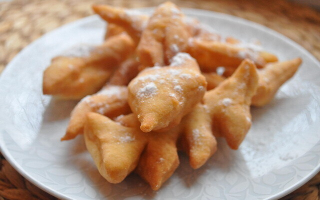 Сделайте шарики из теста, а затем раскатайте из них лепёшки толщиной около 8 миллиметров. Каждую лепёшку надрежьте в середине, один край проденьте через дырку и слегка выверните. У Вас получаться своего рода петельки из теста, которые останется только обжарить.