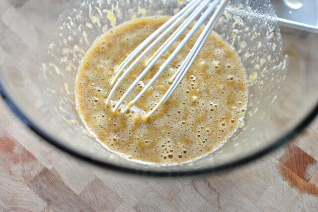 Сливочное масло растопите и смешайте с яйцами, туда же влейте молоко.