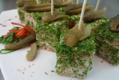 Канапе с салом, или, как их можно назвать, сало-суши — прекрасная закуска к водке. Чтобы ее приготовить, нарезаем хлеб и сало тонкими ломтиками. Чеснок также нарезаем на пластинки. Сворачиваем сало в кулек, помещаем в центр корнишон или чеснок и прикалываем шпажкой к хлебу.