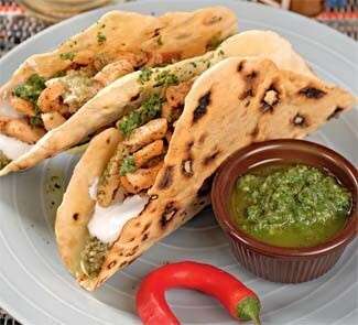 Куриное филе нарезать небольшими кубиками. Растительное масло смешать с орегано, чили, солью и паприкой. Добавить кусочки куриного филе и хорошо перемешать. Обжарить на сковородке в разогретом масле. Авокадо очистить от кожицы, вынуть косточку, нарезать небольшими кусочками и размять до пюре. Посолить и полить лимонным соком. Хлебные тартилии (можно лаваш) смазать пюре из авокадо и сметаной. Сверху положить куриную начинку и завернуть. Подавать вместе с сальсой верде.