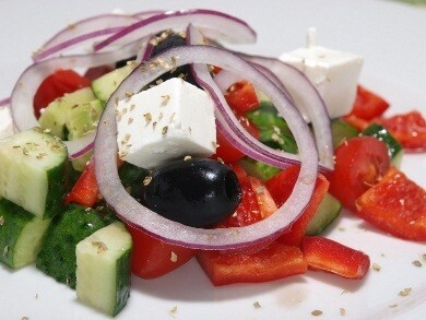 Греческий салат (также «деревенский») — салат из свежих овощей (томат, огурец, шалот), маслин и сыра (феты), заправленный оливковым маслом с солью и чёрным перцем. Часто в салат добавляют сладкий перец, реже — каперсы или анчоусы. В рецепт часто включают листовой салат.