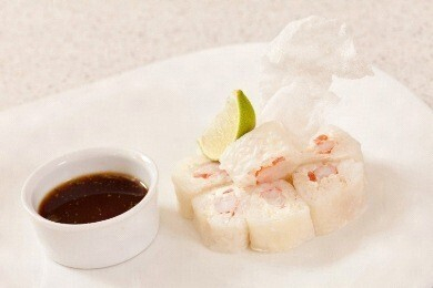 Воду доводим до кипения, добавив туда немного соли. Опускаем креветку в кипящую воду. Доводим воду до закипания (вместе с креветкой), достаем. Очищаем креветку от панциря, удалям со стороны спинки темную жилку, и удаляем хвосты. У помидоров черри удаляем сердцевину (мякоть). На бамбуковую циновку (макису) выкладываем лист рисовой бумаги и слегка смачиваем водой. Ровным слоем на рисовую бумагу выкладываем рис. По центру и по всей длине, обратной стороной чайной ложки, выкладываем сливочный сыр (филадельфия). Рядом с сыром выкладываем помидоры черри. Тоже самое проделываем с отварными креветками. Сворачиваем ролл. Ролл нарезаем на 8 равных частей. В соевый соус добавляем белое вино. На мелкой терке натираем цедру лайма. Добавляем цедру в соус. Выжимаем в соус сок лайма и все перемешиваем. Приятного аппетита!