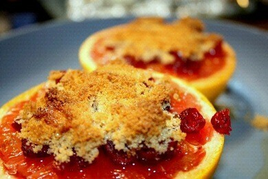 Нагреваем духовку до 200 С. Грепфрут разрезаем пополам. Коричневый сахар, корицу, соль, перец и измельченно печенье смешиваем до однородной массы. На грепфрут выкладываем клюкву, затем маслянно - сахарную смесь. Запекаем в предварительно разогретой духовке 5-10 минут. Время дается предположительное, потому, что у каждой духовки могут быть свои особенности. Наша цель - румяная корочка и полностью растворившийся сахар.