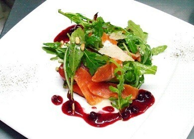 Готовим салат – смешиваем рукколу, нарезанные соломкой морковь и цукини, обжаренный на сухой сковороде кедровый орех и мякоть помело. Слегка сбрызгиваем уксусом, добавляем немного соли и заправляем маслом. Приятного аппетита!