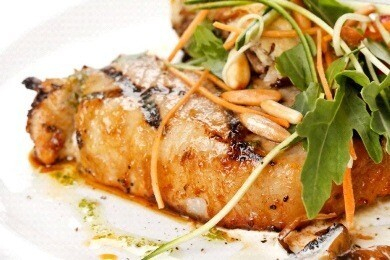 Массивный кусок свинины быстро маринуем в смеси соевого соуса, мёда и горчицы. Обжариваем с двух сторон и доводим до готовности в жарочном шкафу при 180 С 10-12 минут.