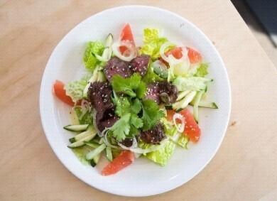 Салат мелко нарезаем и кладём на тарелку, сверху – нарезанные брусочком огурцы и цукини. Говяжью вырезку нарезаем на ломтики, солим и быстро обжариваем с двух сторон на сковороде. Кладём поверх всех овощей. Украшаем салат дольками грейпфрута, слегка маринованным в уксусе репчатым луком и зеленью. Посыпаем салат кунжутом и заправляем соусом. Приятного аппетита!