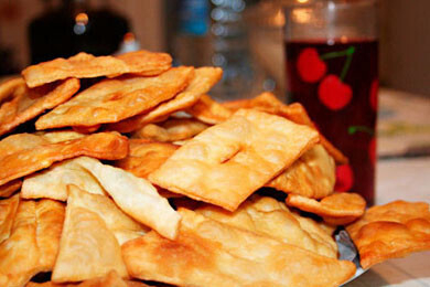 Замешиваем тесто из муки, яиц, сметаны и вина. Добавляем измельченный свежий укроп, мелко нарезанные обжаренный лук и грецкие орехи. Раскатываем тонкое тесто и режем ровные полоски шириной примерно в 2-3 см. Придаём полоскам любую форму и обжариваем в горячем масле до золотистого цвета. Необычный готовый хворост можно поперчить и посолить.