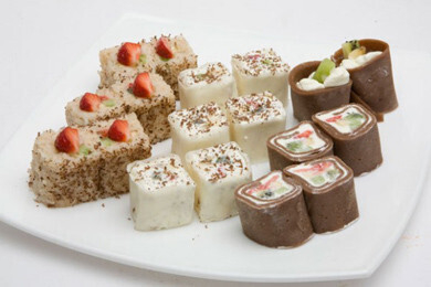 Сыр «Филадельфия» смешиваем с сахаром. Если масса выйдет слишком густая, разбавим её молоком или водой. Фрукты режем очень мелко и перемешиваем с сыром. Суши из блинов готовим по принципу обычных суши. Вспоминаем, как выглядят нори. Придаём готовым блинам квадратную форму, чтобы было удобнее закатывать сладкие роллы. Фруктовую смесь выкладываем на блин и закручиваем. Полученную «колбаску» разрезаем на аккуратные кусочки. Чтобы блюдо выглядело красиво, поливаем роллы любым джемом или сиропом и украшаем листиком мяты.