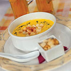 Гаспачо становится вкуснее, постояв в холодильнике пару часов. Когда вы подаете его гостям, поставьте рядом маленькие тарелочки с крутонами (хрустящими сухариками), мелко порезанным сладким перцем, порезанными огурцами и луком, чтобы каждый мой посыпать свой суп добавками по желанию.